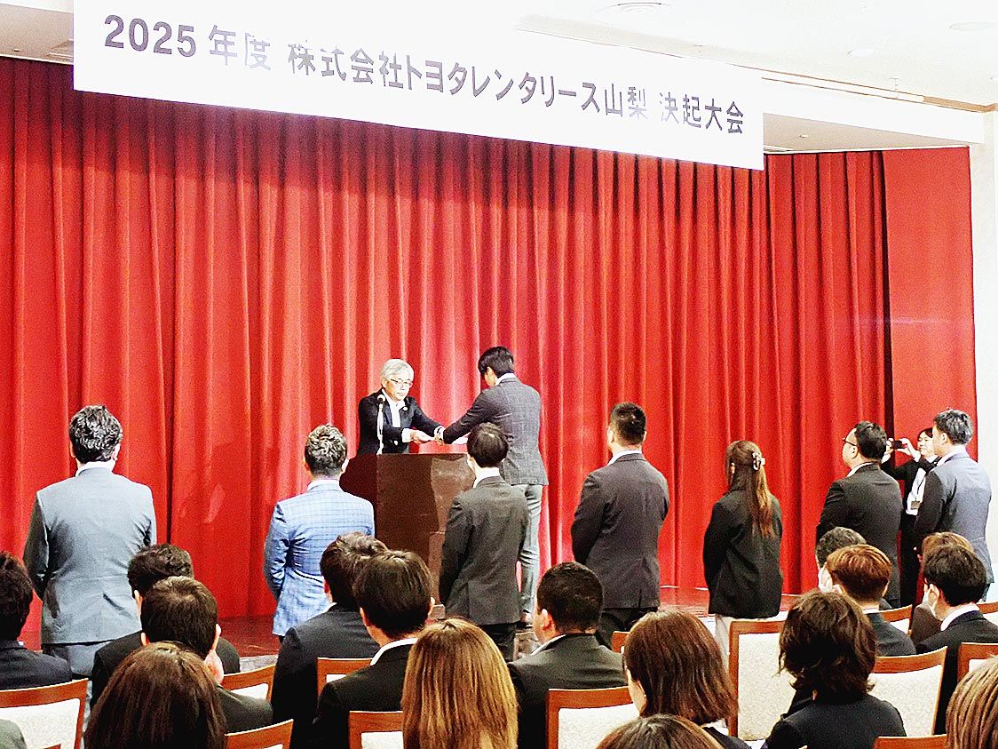 【甲府】トヨタレンタリース山梨(佐々木宏明社長)は、昭和町内の式場で開催した2025年度決起大会の席上、「24年度年間優秀社員表彰」を実施した。受賞者は次の通り。(敬称略) ▽リース販売優秀スタッフ賞=板山稜介(本社法人営業部) ▽レンタ...