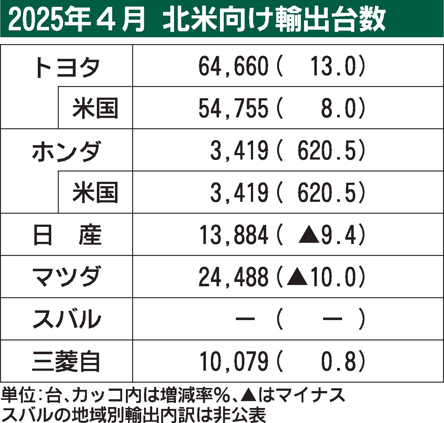 日本自動車工業会(片山正則会長)がまとめた4月の米国向け乗用車輸出は、前年同月比6.7%増の11万3538台と、〝トランプ関税〟の影響は見られなかった。ただ、関税が長期化すれば輸出や生産体制の見直しが避けられず、日本からの輸出が減る可能性...