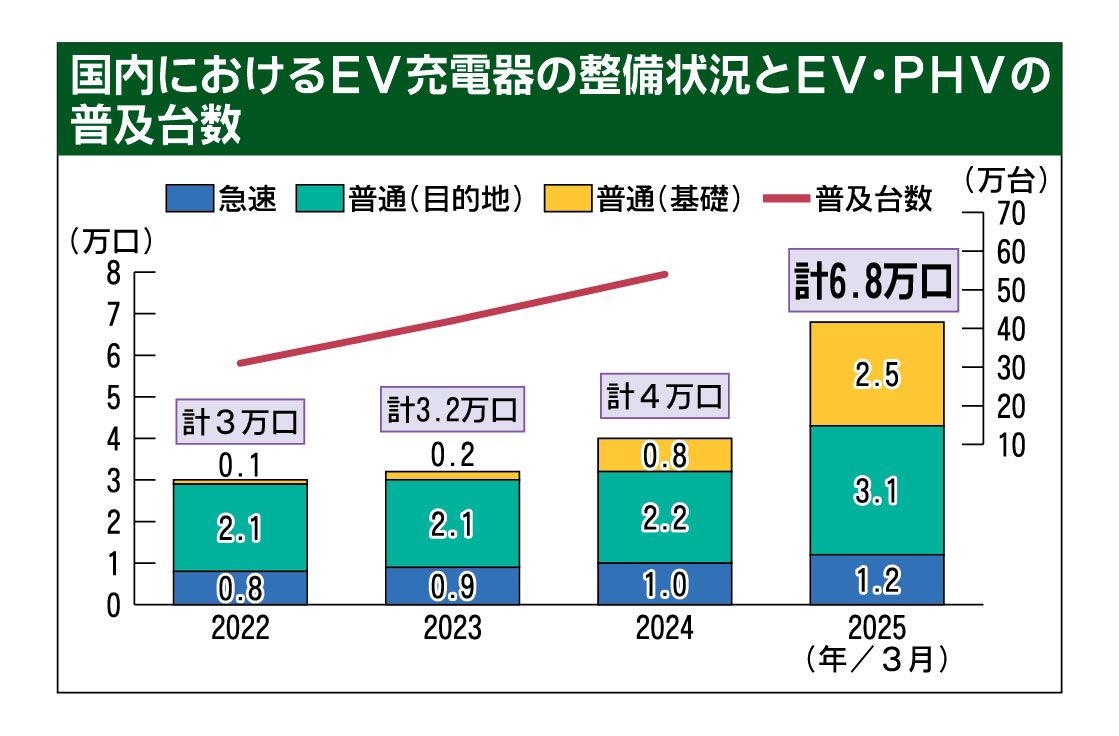 国内の電気自動車(EV)の充電網(充電口ベース)が、2025年3月末時点で約6万8千口に達したことが分かった。経済産業省が近く公表する。主に賃貸の集合住宅や商業施設などで普通充電の整備が進んだため。24年3月末と比べ、約1.7倍(約2万8...