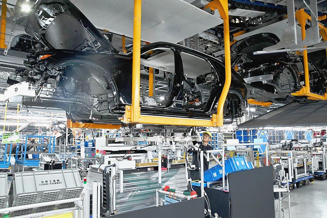防府工場は変量生産と自動化を両立させ、生産効率を高めている。無人搬送車(AGV)上でパワートレインなどを組み立て、車両へ自動で組み付ける。