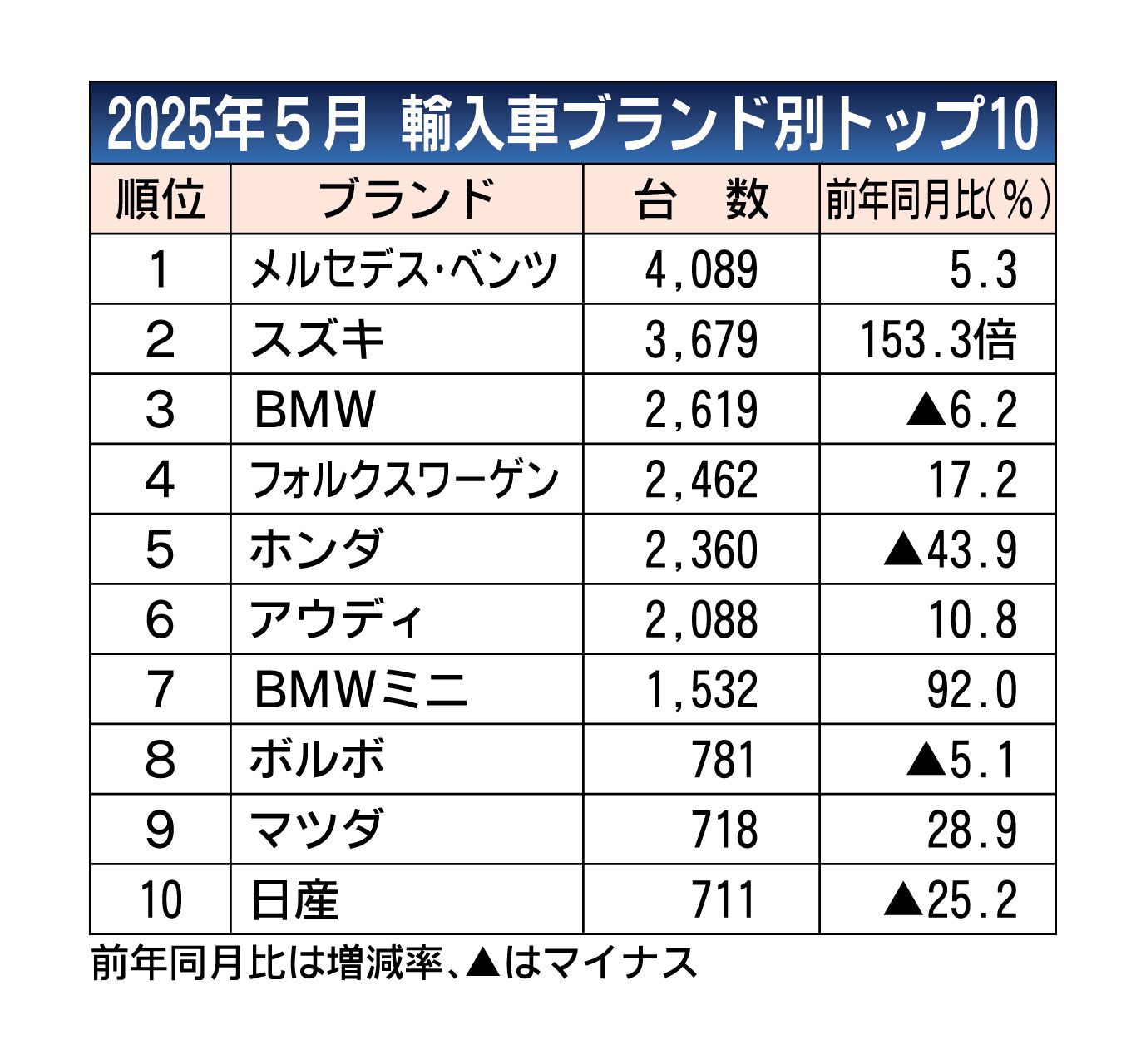 ブランド別では、同5.3%増の4089台を販売したメルセデス・ベンツ(MB)が首位だった。日本メーカーを含めた販売台数でもホンダやスズキを抑え、5カ月ぶりにトップへ返り咲いた。