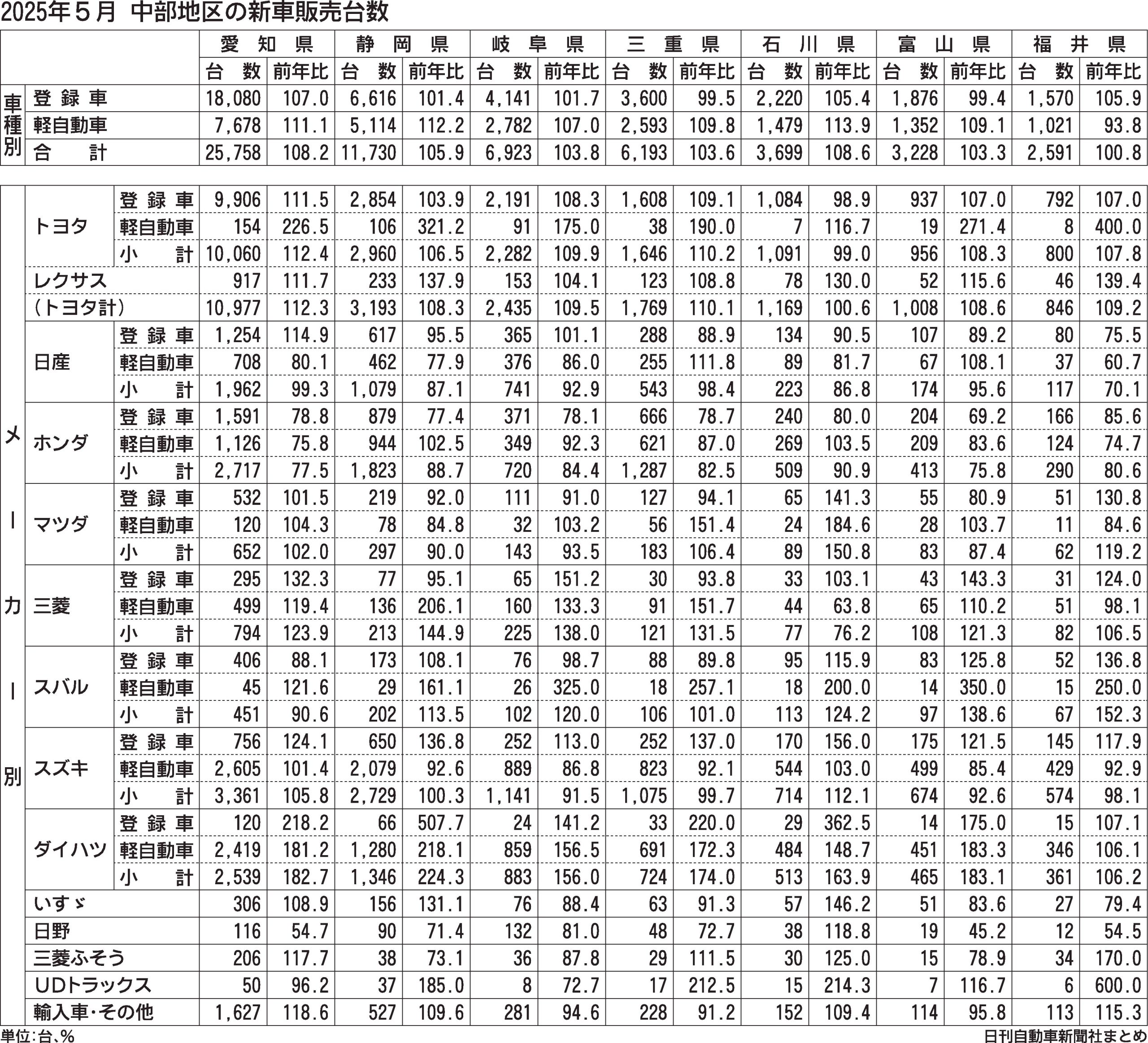 〈2025年5月中部地区の新車販売台数〉