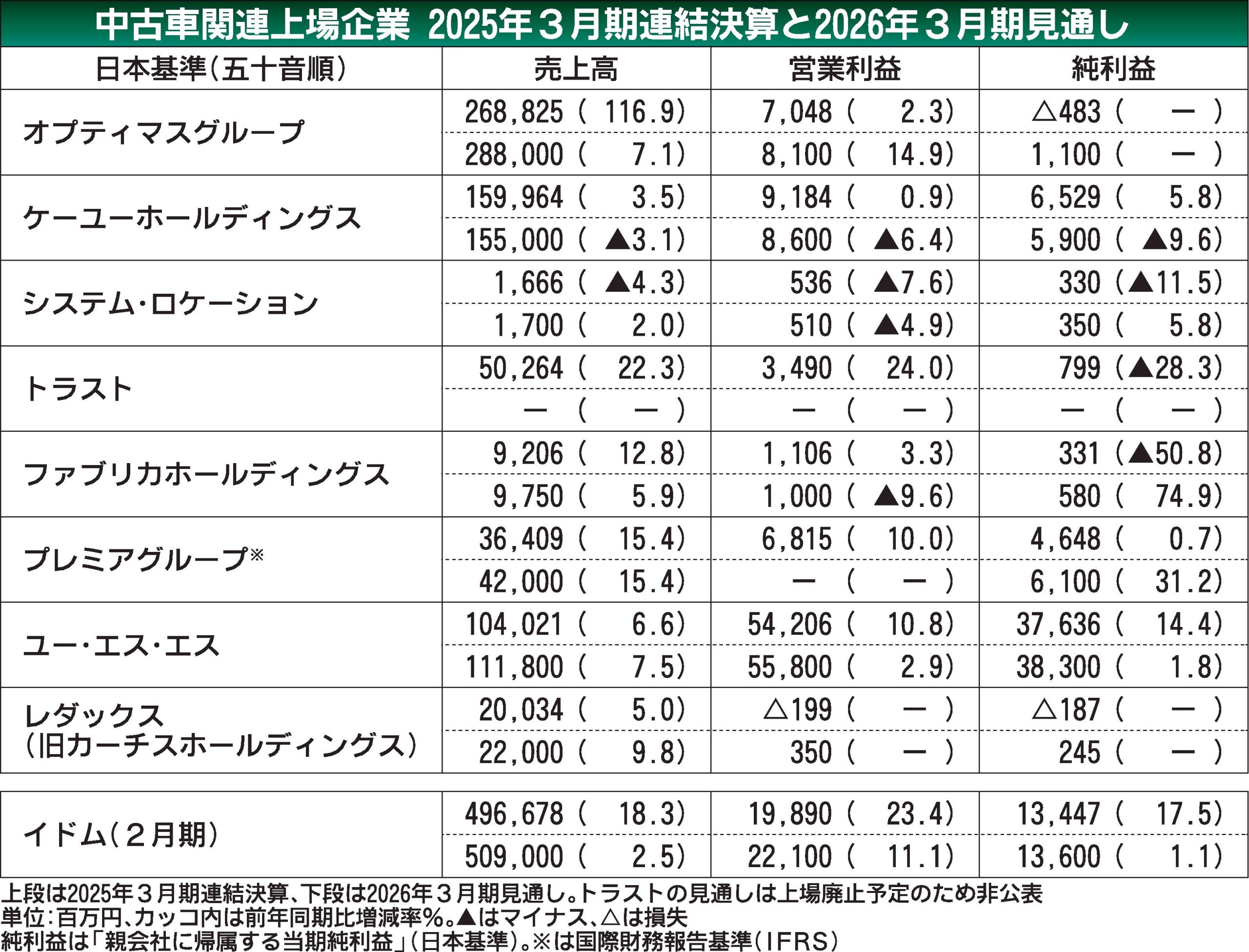 中古車業界で市場回復への期待が高まっている。主な中古車関連の上場企業2026年3月期の連結決算見通しは、上場廃止予定のトラストを除く7社中4社が増収増益を見込んだ。新車の供給拡大で、中古車の流通不足の解消を織り込んだところが多いようだ。2...