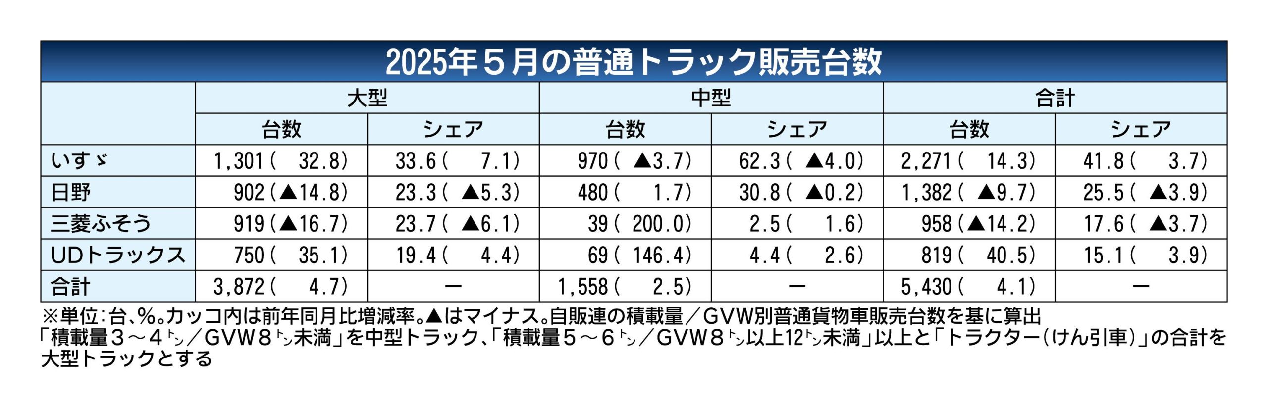 5月の普通トラック(積載量4トン級以上、中・大型の合計)販売は前年同月比4.1%増の5430台で、2カ月ぶりに前年実績を上回った。大型トラック(積載量5トン以上、車両総重量8トン以上、トラクター含む)は3カ月ぶりに増加した。 メーカー別で...