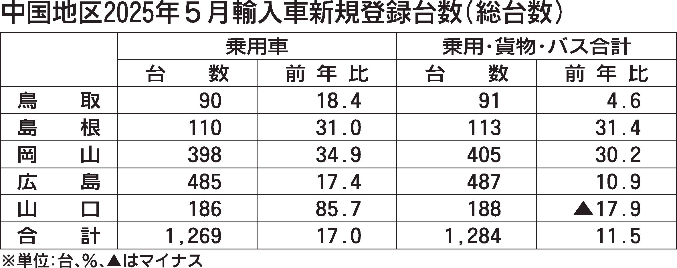 日本自動車輸入組合(JAIA)の発表によると、5月の中国地区の輸入車新規登録台数(外国メーカー車と日本メーカー車)は、前年同月比11.5%増の1284台で5カ月連続で増加した。山口県を除く4県が前年を上回り、引き続き日本メーカー車の海外生...
