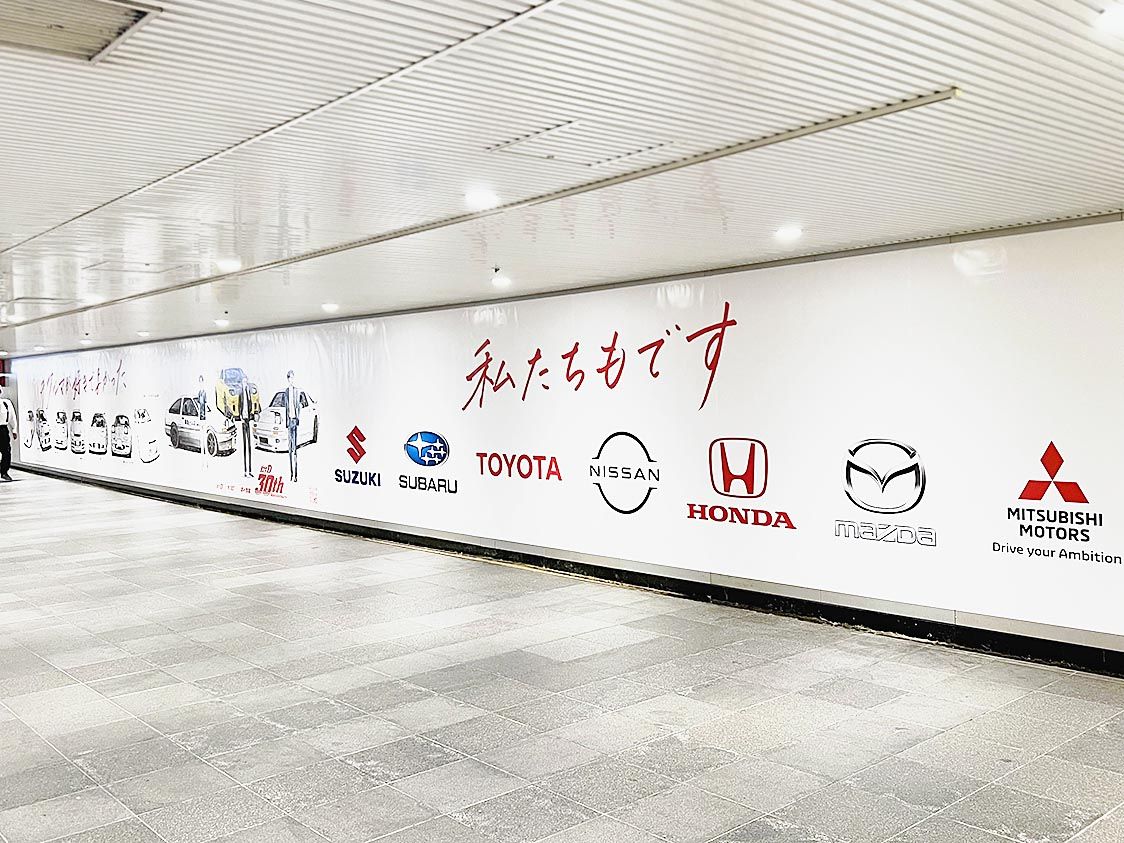 しげの秀一氏の自動車漫画「頭文字(イニシャル)D」と自動車メーカー7社がコラボレーションした広告が東京・渋谷駅地下に掲出されている。連載開始30周年を記念したもので、作者の11年半ぶりとなる書き下ろしイラストとともに、作品と自動車メーカーが「クルマ愛」を宣言している。掲出期間は15日まで。