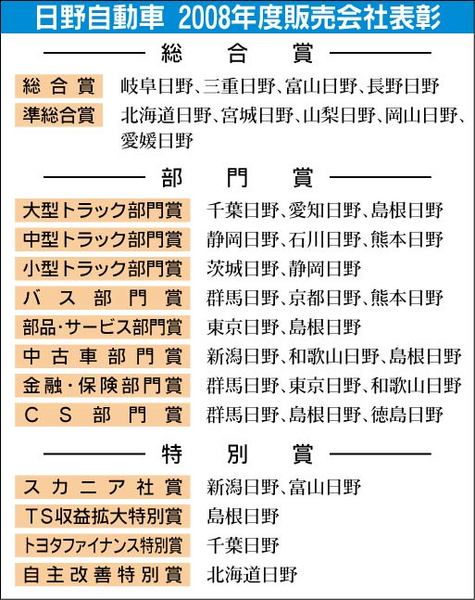 日野自動車は14日、都内のホテルで「2008年度販売会社表彰式」を行った。新車販売やCS(顧客満足)などで優秀な成績を収めた総合賞には、岐阜日野と三重日野、富山日野、長野日野の4社が輝いた。このほか部門賞、特別賞を含め延べ36社を表彰した...