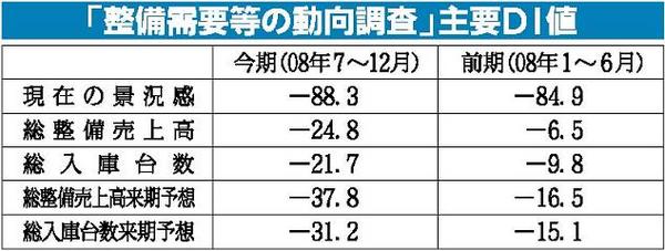 日本自動車整備振興会連合会(日整連、坪内恊致会長)は、2009年1月時点(08年7~12月期)の「整備需要等の動向調査」の集計結果をまとめた。これによると、整備業界全体の現在の景況感DI(プラス成長と回答した事業場の割合―マイナス成長と回...