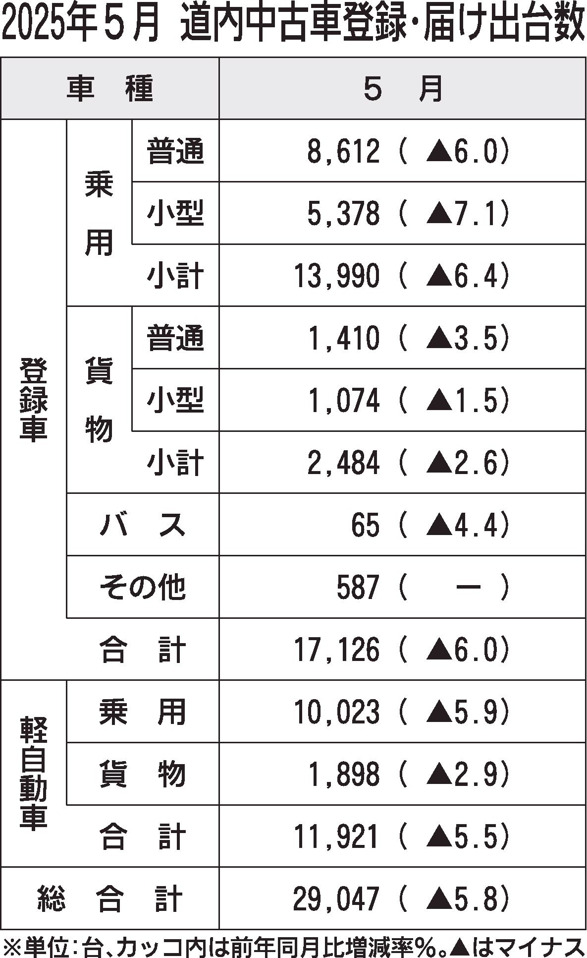 5月の道内中古車登録、届け出台数は、前年同月比5.8%減の2万9047台で、4カ月続けて前年同月を下回った。登録車は4カ月連続、軽自動車は2カ月連続で前年同月を下回った。 日本自動車販売協会連合会の中古車登録台数と全国軽自動車協会連合会の...