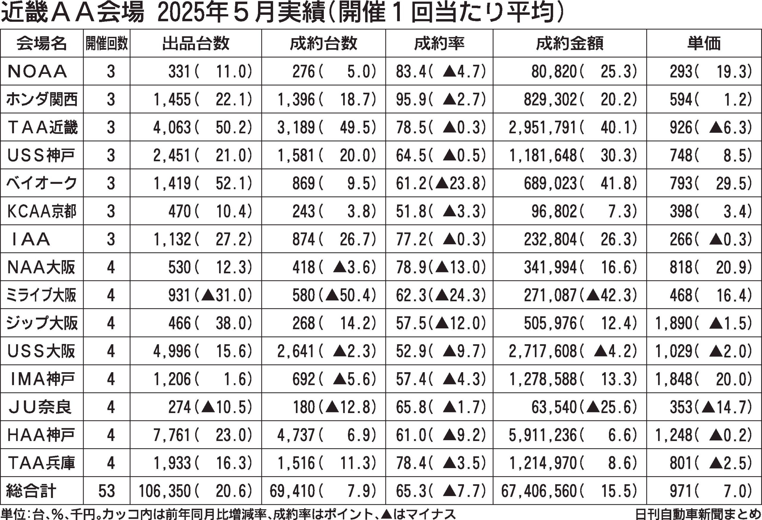 近畿地区の中古車オークション(AA)15会場の5月実績(開催1回当たり平均)がまとまった。開催回数は前年同月比3回減の53回。出品台数の総合計は同20.6%増の10万6350台で、4月に続き大幅伸長した。 会場別の出品台数は、HAA神戸の...