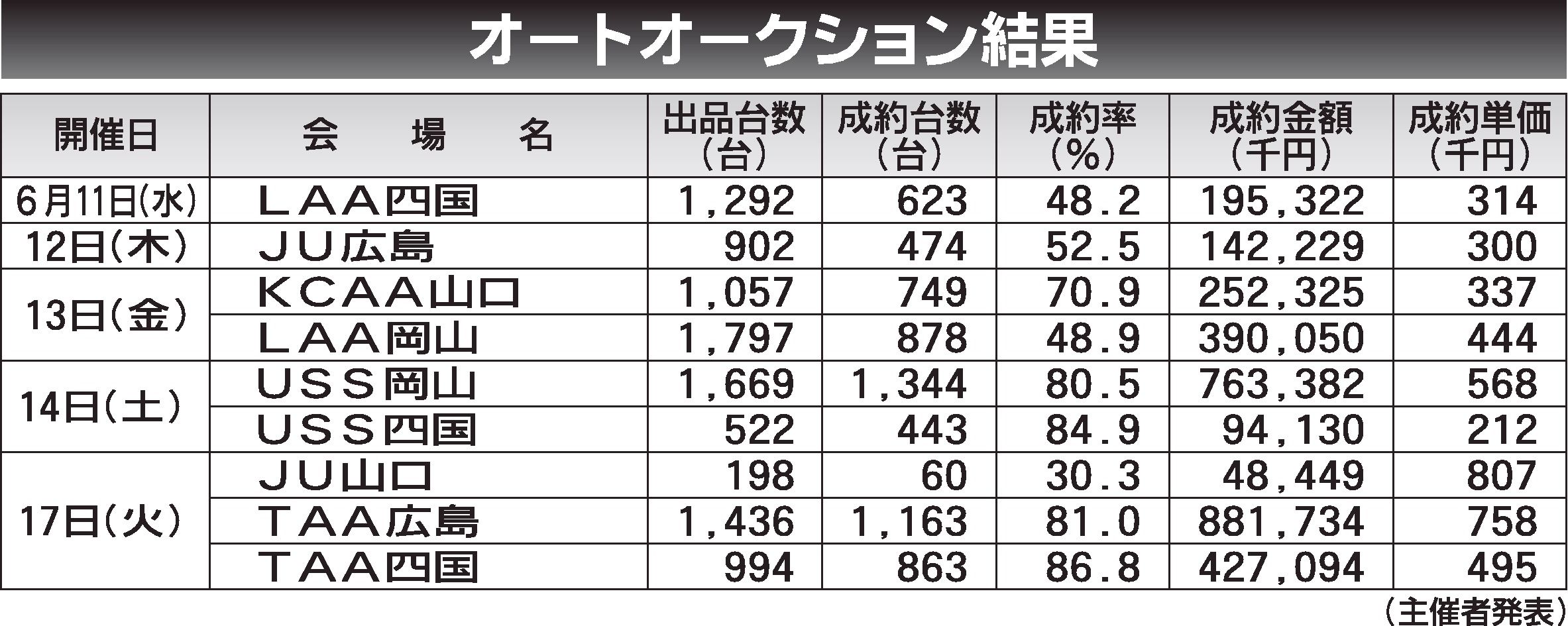 〈オートオークション結果〉中四国地区 2025/6/11~17