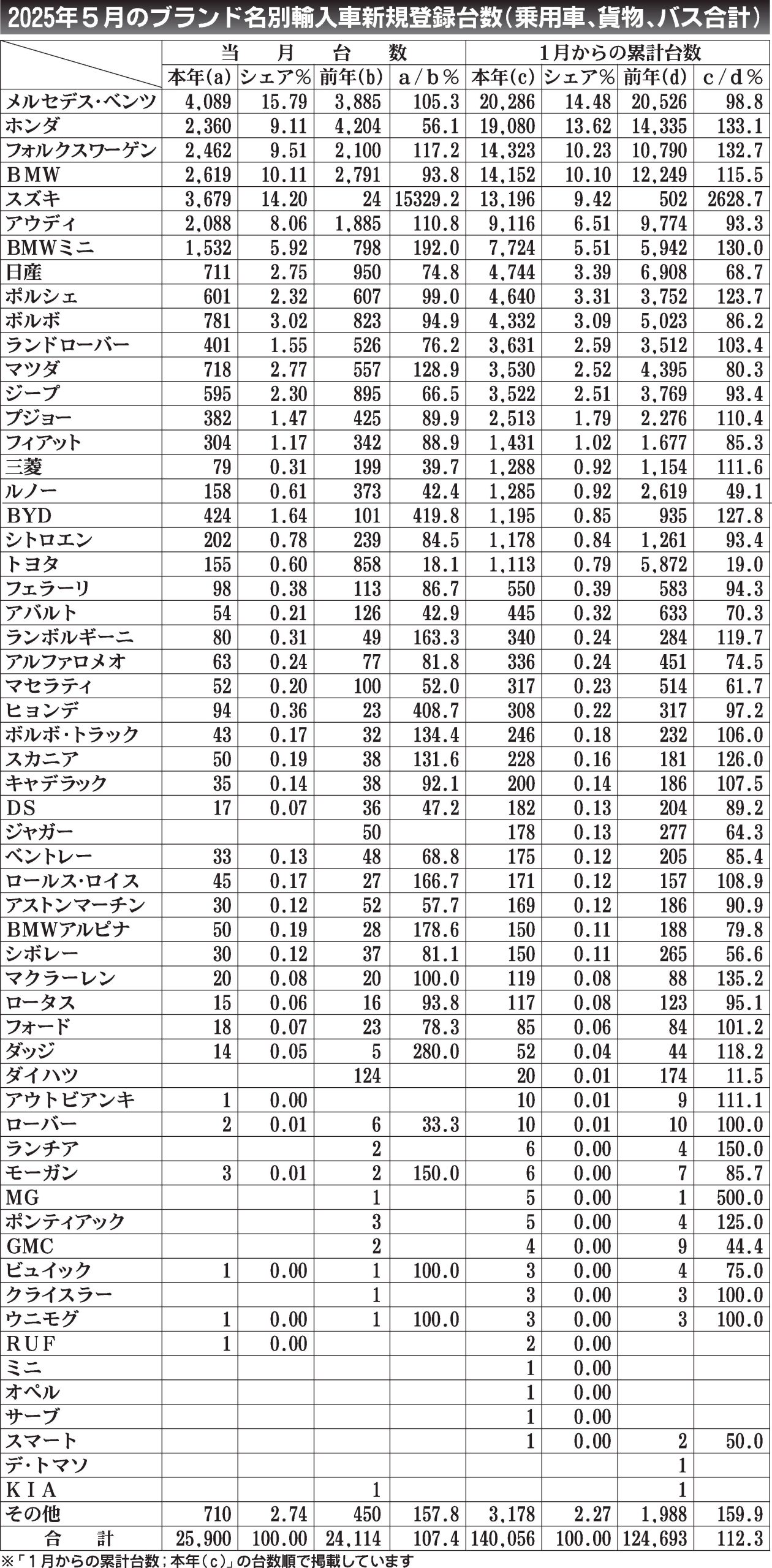 〈2025年5月のブランド名別輸入車新規登録台数(乗用車、貨物、バス合計)〉