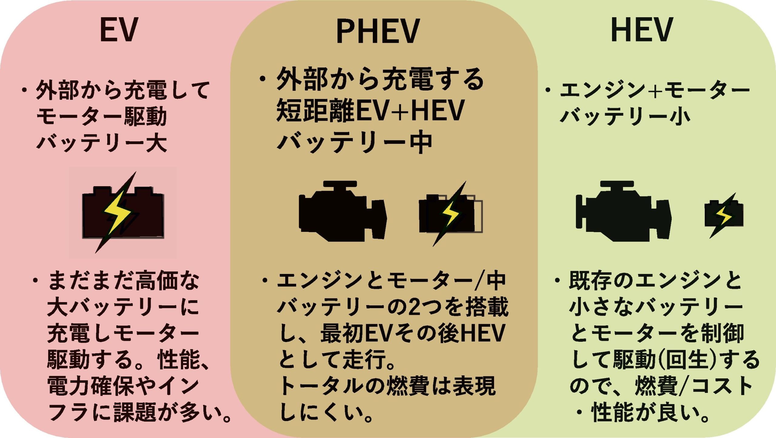 エコカーにはハイブリッド車(HEV)、プラグインハイブリッド車(PHEV)、燃料電池車(FCV)、バッテリー電気自動車(BEV)、レンジエクステンダー(REX)…さまざまなな種類があるが、ユーザーにとって、それぞれの構造や性能については良...