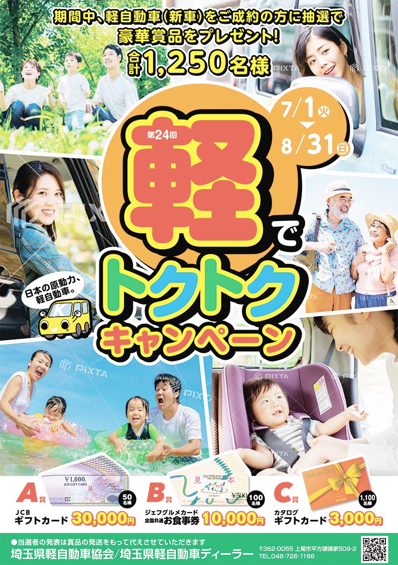 埼玉県軽自動車協会(東智彦会長)は、「第24回軽でトクトクキャンペーン」を7月1日からスタートする。7、8月にかけて軽自動車の新車を成約したユーザーにギフトカードやグルメカードなどを合計1250人にプレゼントする。 同キャンペーンは、軽自...
