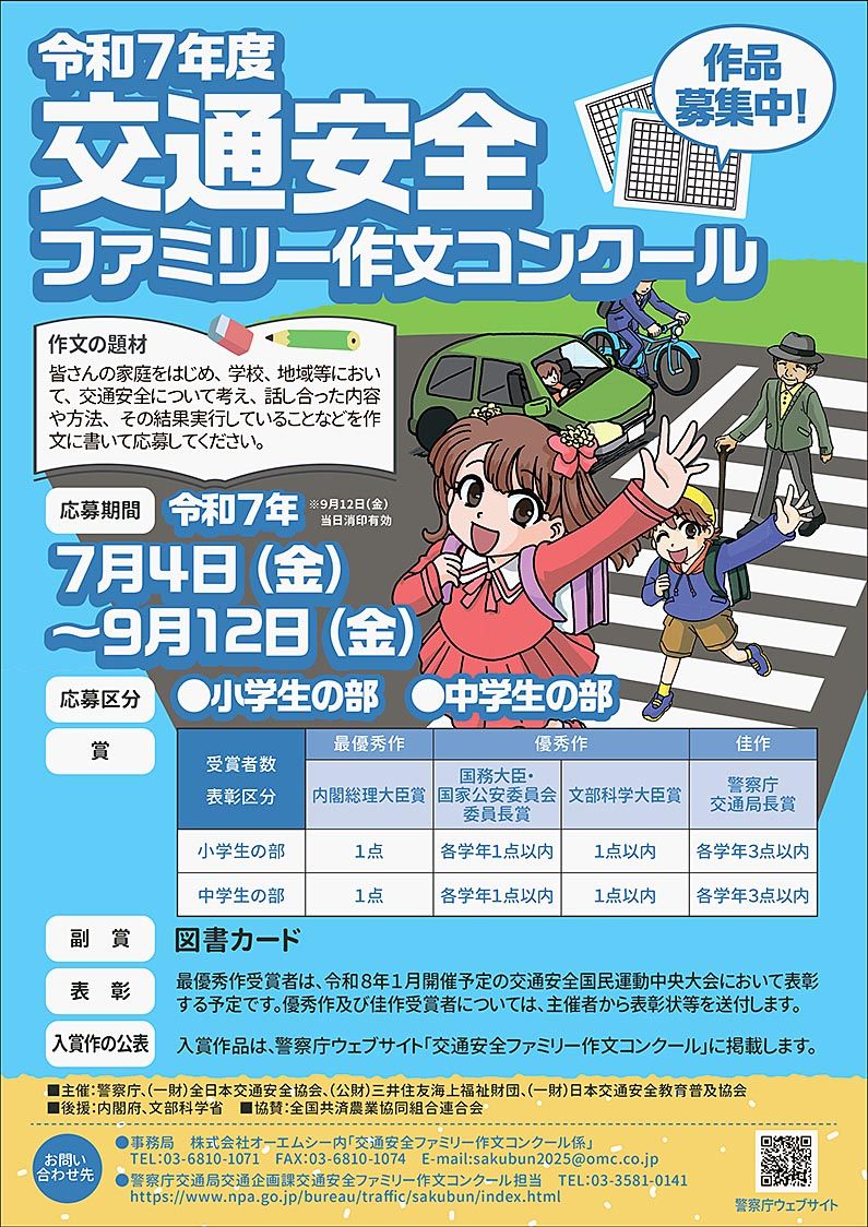 警察庁と全日本交通安全協会、三井住友海上福祉財団、日本交通安全教育普及協会の主催。作品の字数は、1200文字(400字詰め原稿用紙3枚)程度とする。ただし、小学1、2年生は400字から、小学3~6年生は800字からでも応募できる。応募は9月12日(当日消印有効)まで。応募方法など詳しくは警察庁のウェブサイトへ。