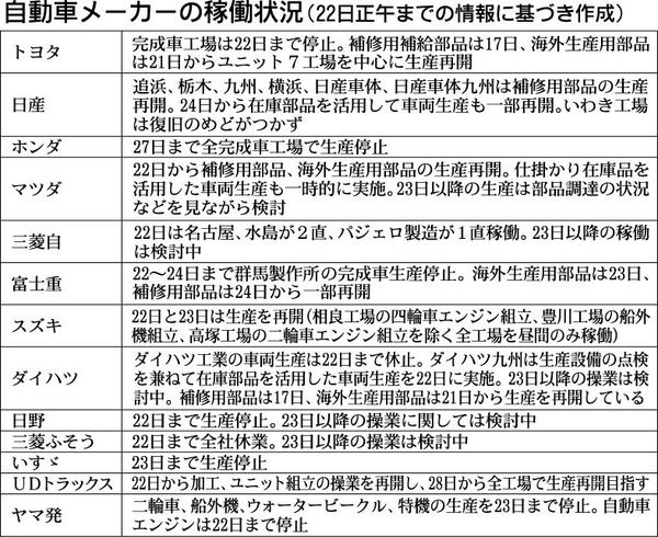 地震被害や東京電力福島第一原子力発電所の事故の影響で、自動車メーカーでは本格的な生産再開の見通しが立たない状況が続いている。ホンダでは直接取引のある一次仕入れ先のうち30社が地震や原発事故の影響を受け、生産再開になお時間がかかる見通し。富...