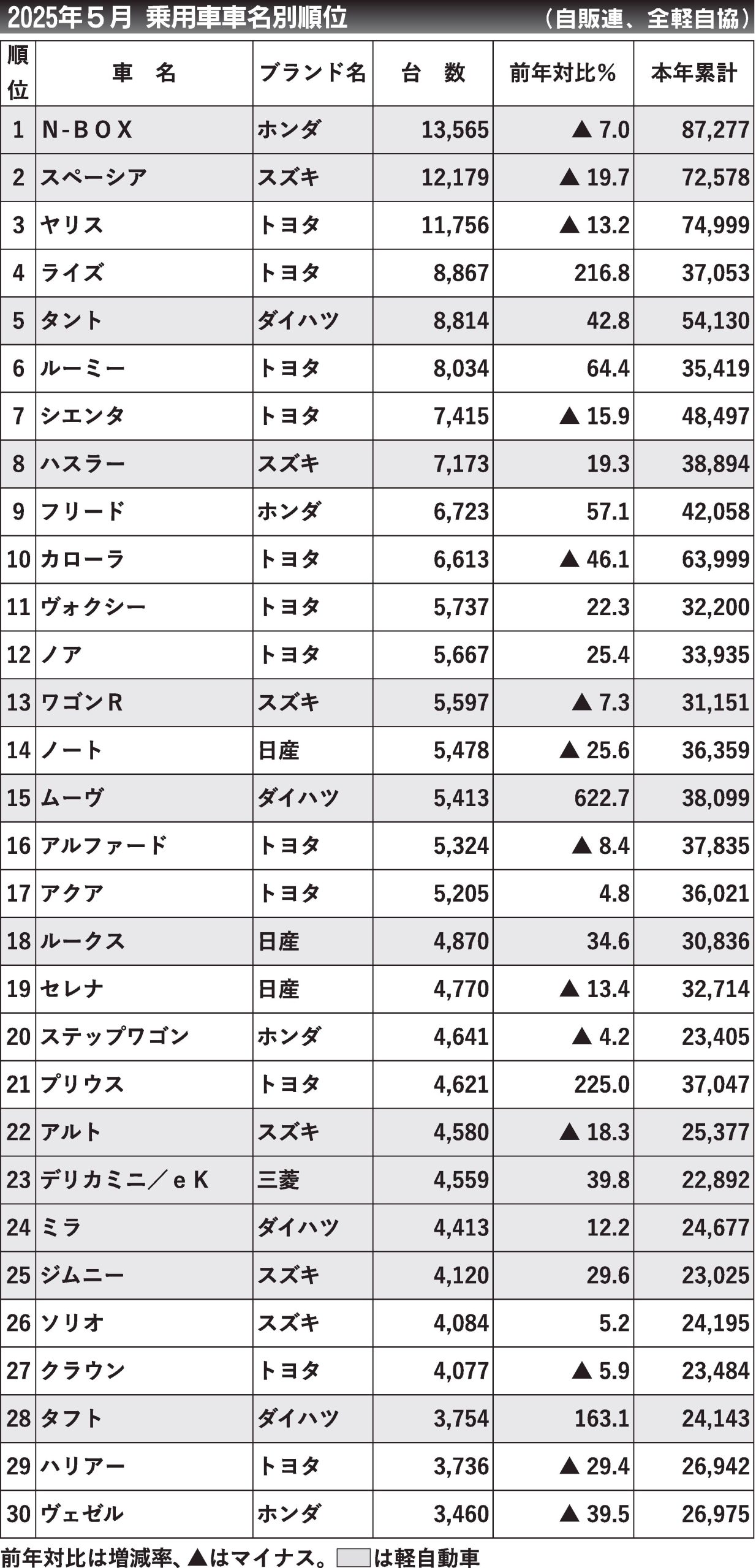 〈2025年5月 乗用車車名別順位〉