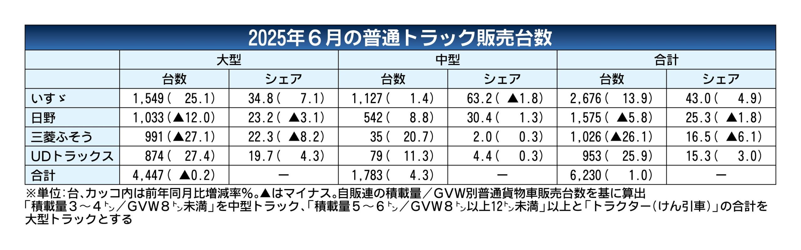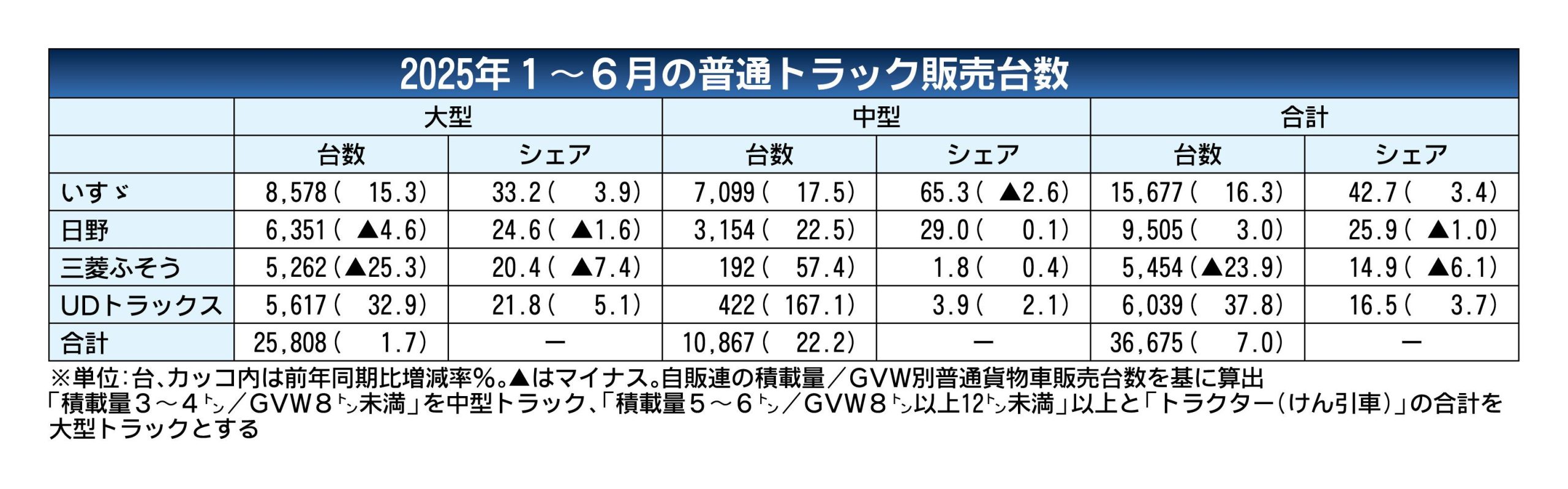 2025年上期(1~6月)の普通トラック(積載量4トン級以上、中・大型の合計)国内販売は前年同期比7.0%増の3万6675台と、上期として3年連続で増加した。シェアはいすゞ自動車が42.7%を占めた。6月には日野自動車と三菱ふそうトラック...