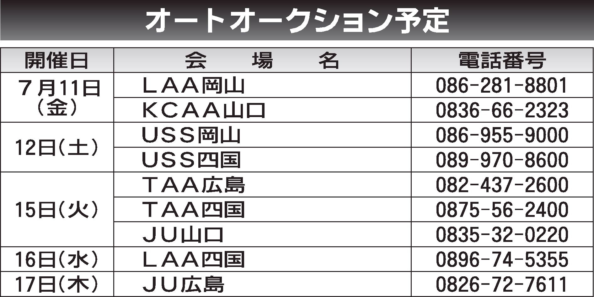 〈オートオークション予定〉中四国地区 2025/7/11~17