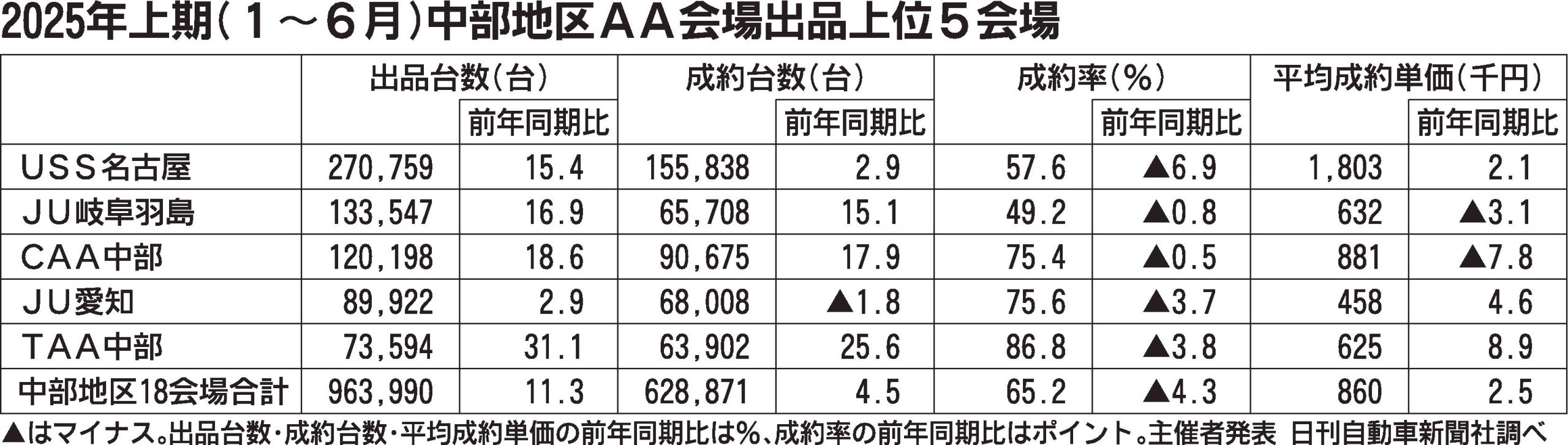 2025年上期(1月~6月)の中部地区中古車オークション(AA)18会場の実績(主催者発表、日刊自動車新聞社集計)は、出品台数が前年同期比11.3%増の96万3990台だった。年明け以降新車販売が上向き、流通台数が増加したことが寄与した。...