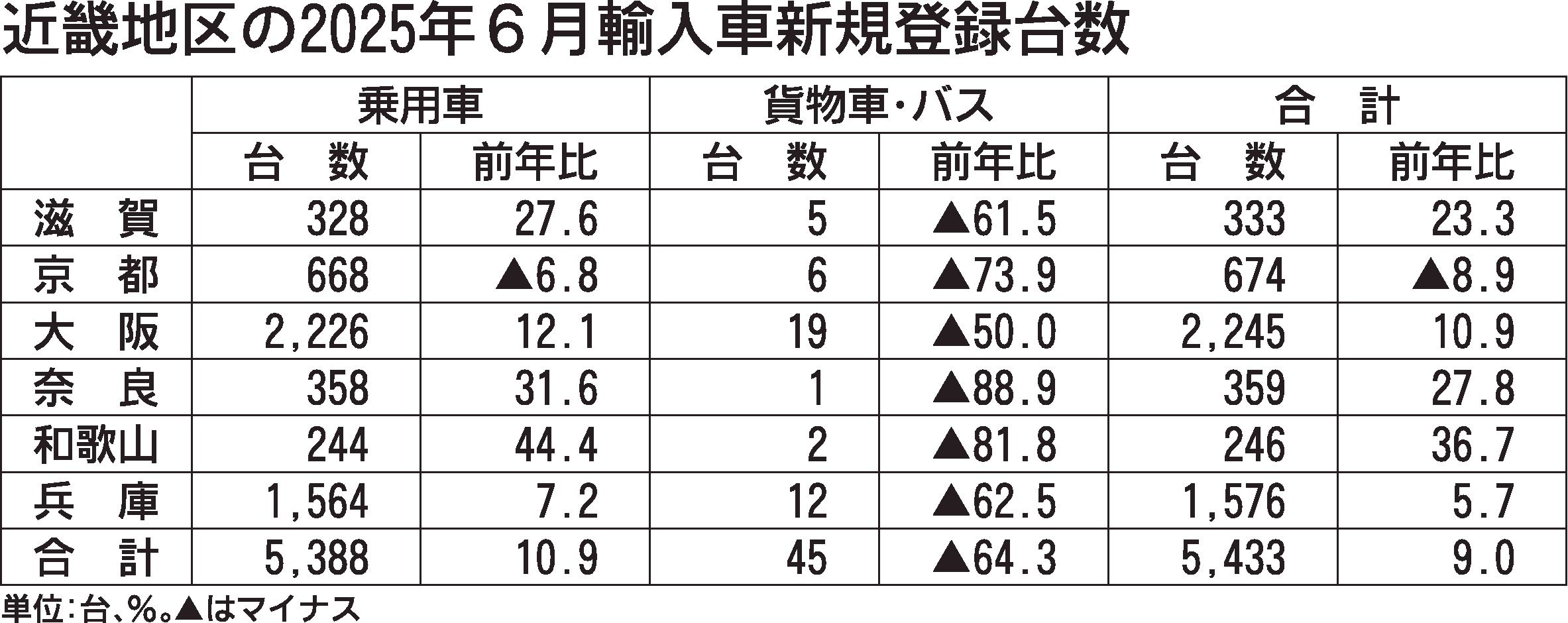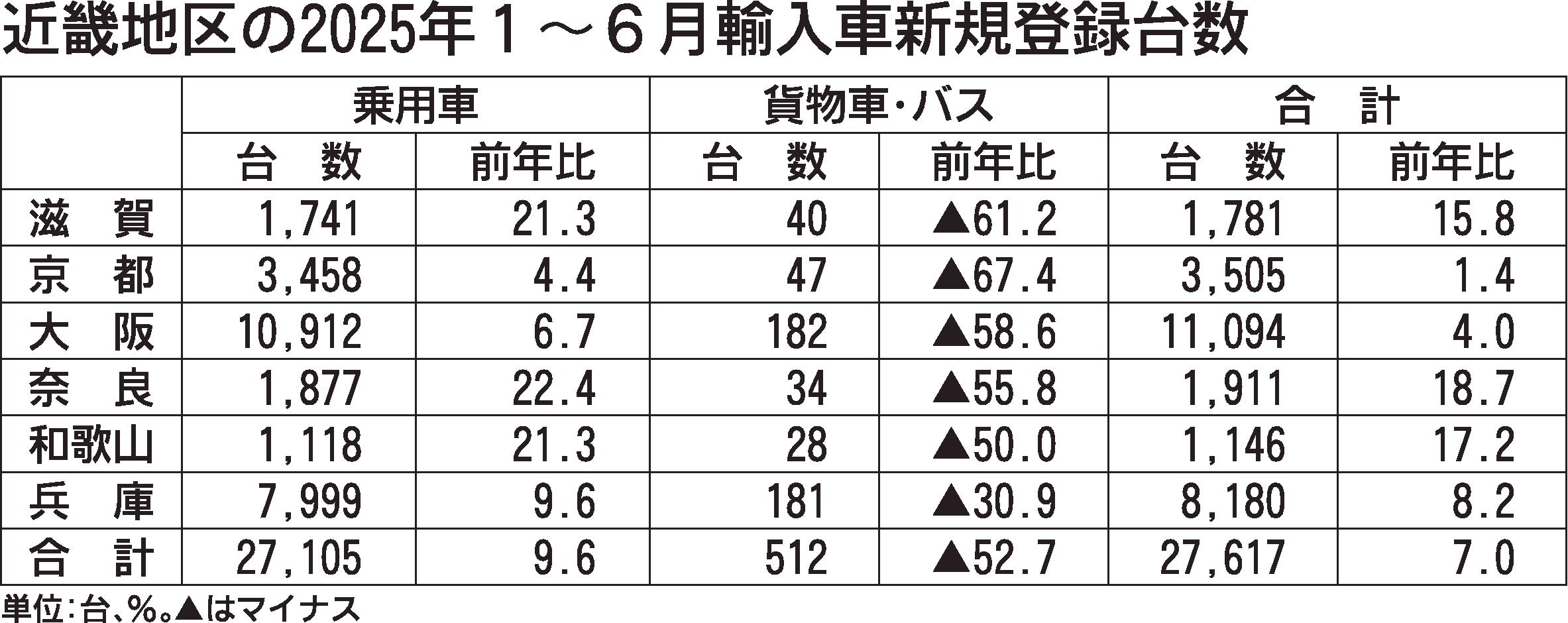 日本自動車輸入組合(JAIA)の発表によると、2025年上期(1~6月)の近畿地区の輸入車新規登録台数(外国メーカー車と日本メーカー車)は、前年同期比7.0%増の2万7617台と上期として4年ぶりにプラスへ転じた。コロナ禍前の19年上期(...