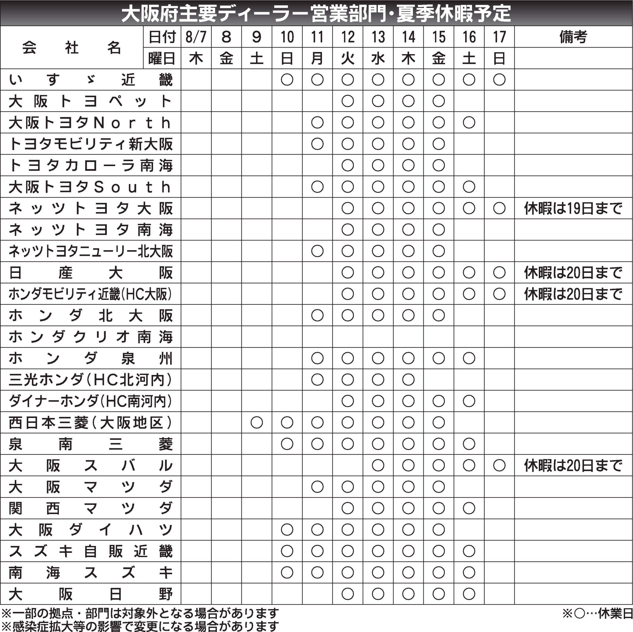 〈大阪府主要ディーラー営業部門・夏季休暇予定〉