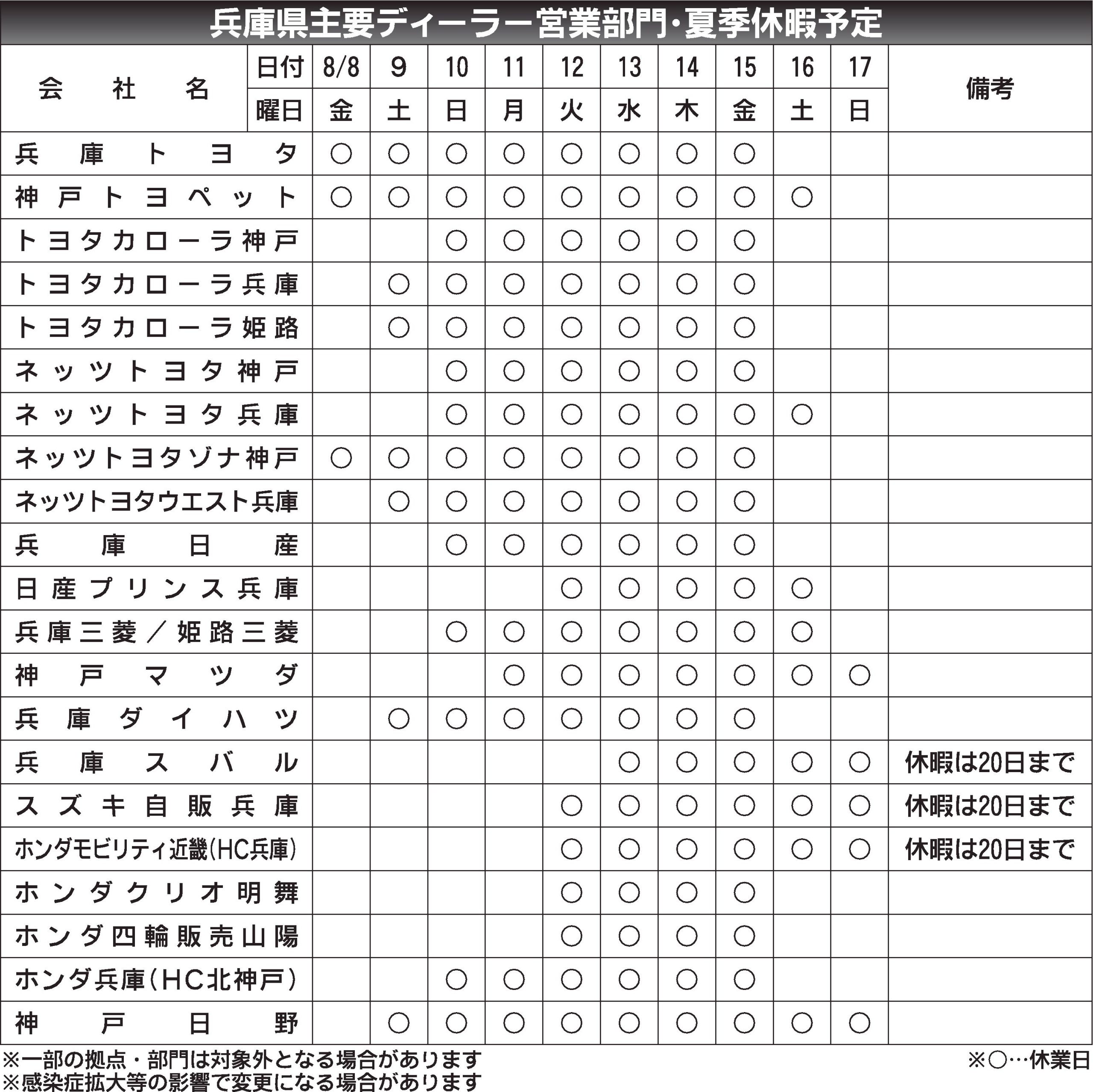 〈兵庫県主要ディーラー営業部門・夏季休暇予定〉