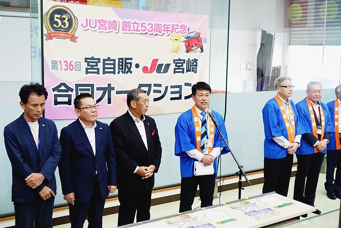 【宮崎】JU宮崎(平山学理事長)は宮崎市内の常設会場で、「JU宮崎創立53周年記念/第136回宮自販・JU宮崎合同オークション」を開催した。出品台数は目標の350台を上回る396台で、成約率は81.3%だった。 オークション前のセレモニー...