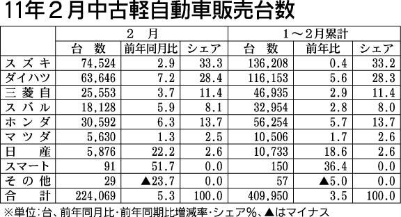 全国軽自動車協会連合会(全軽自協、小谷忠幸会長)がまとめた2011年2月の中古軽自動車販売台数は、前年同月比5・3%増の22万4069台で4カ月連続でプラスを維持した。 車種別では、乗用車が前年同月比4・2%増の16万449台、貨物車が同...