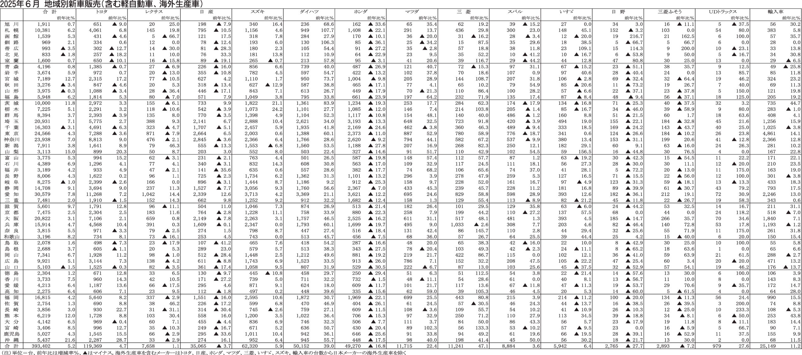 〈2025年6月地域別新車販売(含む軽自動車、海外生産車)〉