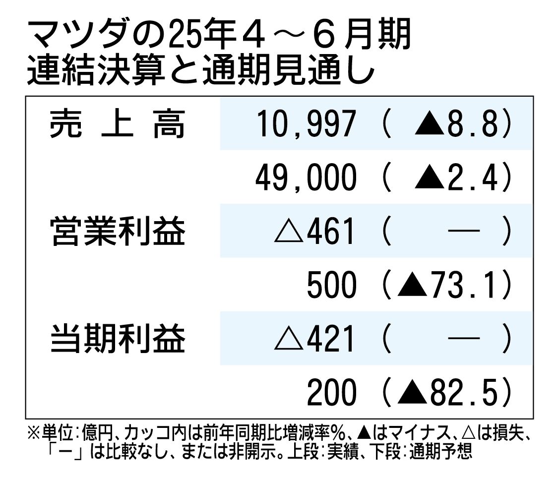 マツダは8月5日、2025年4~6月期決算は米国の追加関税や為替の影響により、営業損益が461億円、純損益が421億円の赤字だったと発表した。追加関税などの影響が不透明として公表を見送っていた26年3月期の通期見通しも発表し、純利益は前期比82.5%減の200億円、売上高は同2.4%減の4兆9000億円とした。