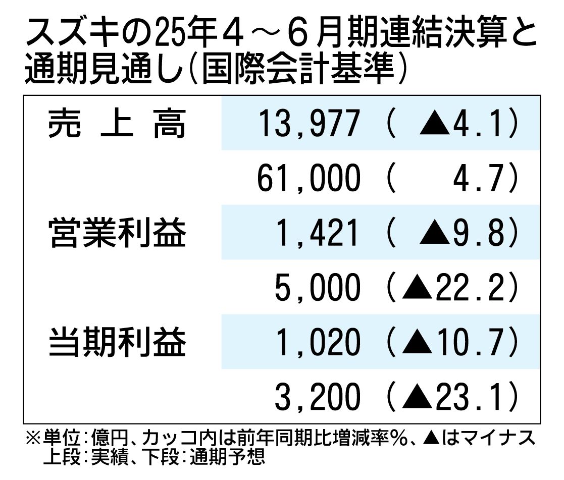 スズキが8月5日に発表した2025年4~6月期決算は、主力のインドや欧州の販売台数の落ち込みに加えて為替影響もあり、売上高が前年同期比4.1%減の1兆3977億円、営業利益が同9.8%減の1421億円となり、5年ぶりの減収・営業減益だった。当期純利益は同10.7%減の1020億円で3年ぶりに減少した。通期見通しは、先行きが不透明として5月の公表値を据え置いた。
