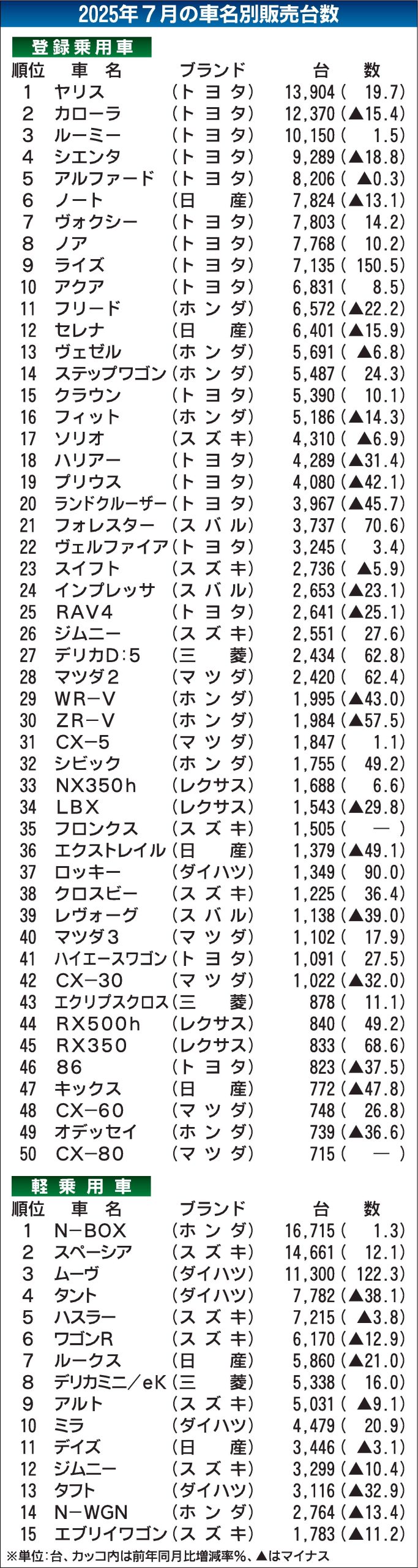 2025年7月の新車販売ランキング、N-BOXが3カ月連続首位 2位はスペーシア