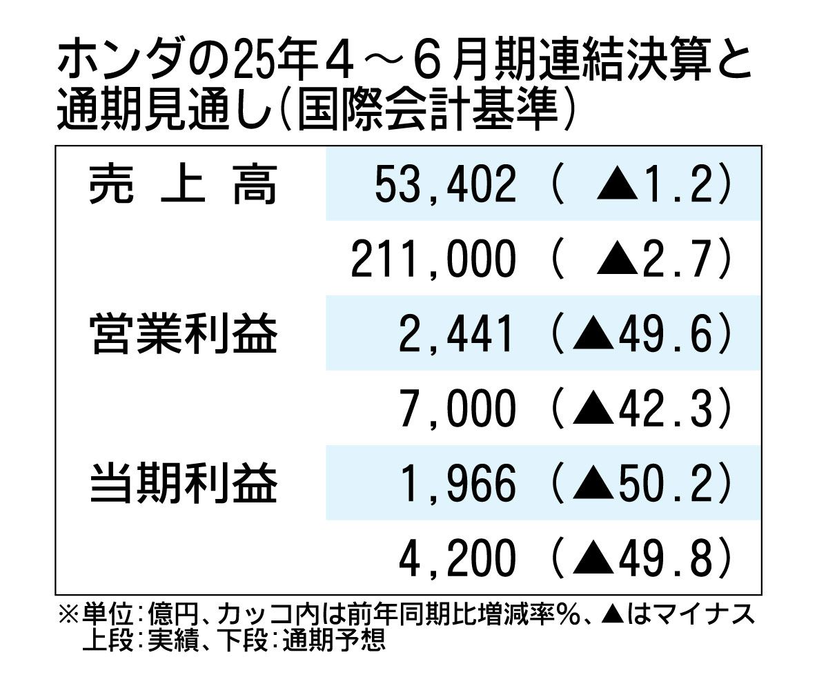 25年4~6月期は、売上高が同1.2%減の5兆3402億円、営業利益は同49.6%減の2441億円、当期純利益は50.2%減の1966億円だった。四輪事業は296億円の営業損失で、20年4~6月期以来の赤字。堅調な二輪事業や金融サービス事業がカバーした。