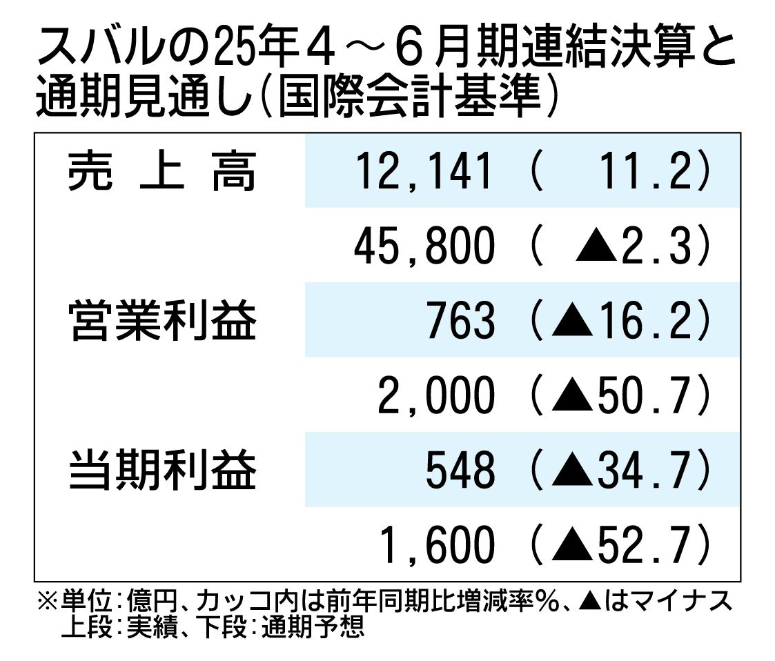 スバルは8月7日、2026年3月期通期の営業利益が前期比50.7%減の2000億円となると発表した。米国の追加関税による影響額は、関税率が9月1日に15%に変更される前提で2100億円と想定する。車種別に仕向け地や出荷量を調整するなどして黒字を確保する。25年4~6月期は売上収益は前年同期比11.2%増の1兆2141億円と増えたものの、営業利益は同16.2%減の633億円だった。