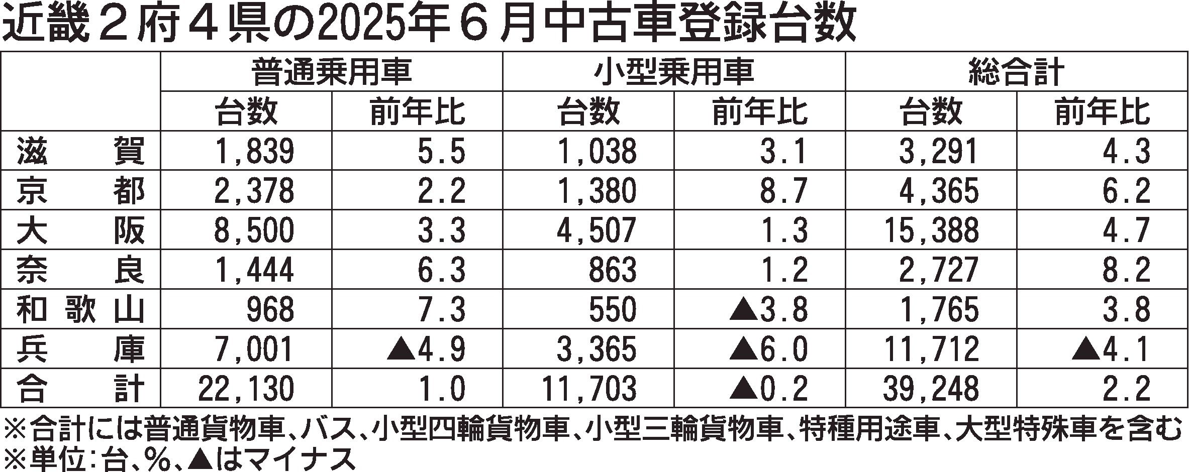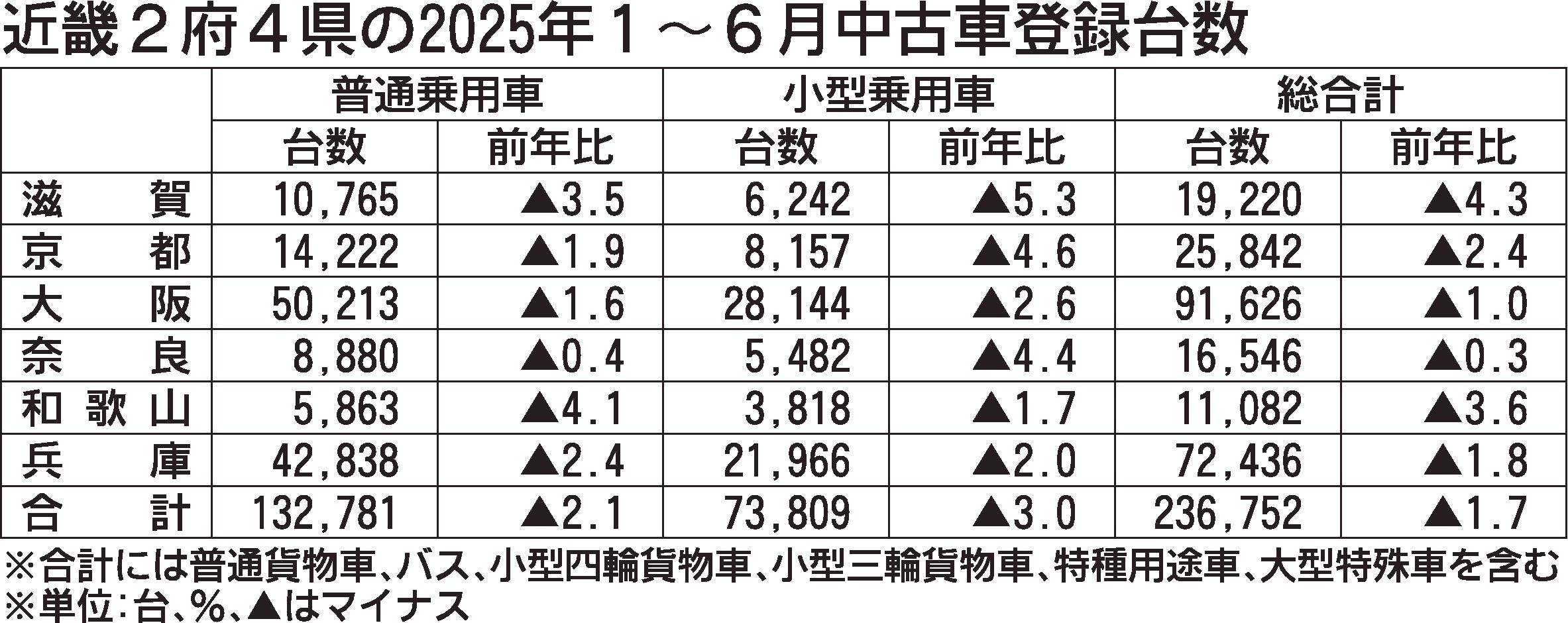 近畿2府4県の上期(1~6月)の中古車登録実績(軽自動車を除く)がまとまった。新規・移転・変更手続きを合算した登録台数は、前年同期比1.7%減の23万6752台で、上期としては2年ぶりに減少した。自動車メーカーで相次いだ認証不正の影響によ...