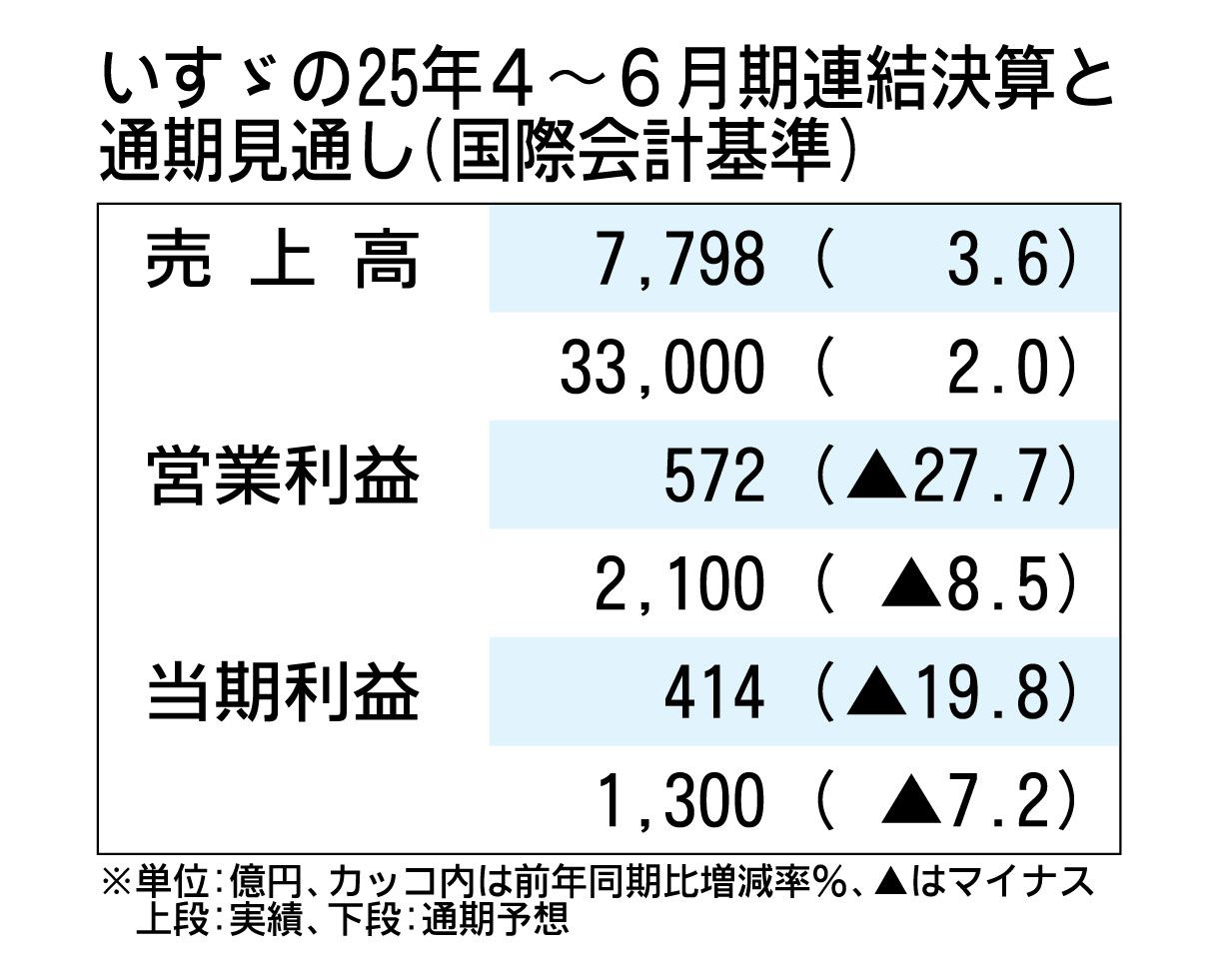 いすゞ自動車が8月7日に発表した2025年4~6月期決算は、売上高が前年同期比3.6%増の7798億円、営業利益は同27.7%減の572億円、当期純利益は同19.8%減の414億円だった。4~6月期での米国の追加関税による影響は軽微で、25年度後半に関税影響の計上を見込む。通期業績見通しは5月公表値を据え置いた。