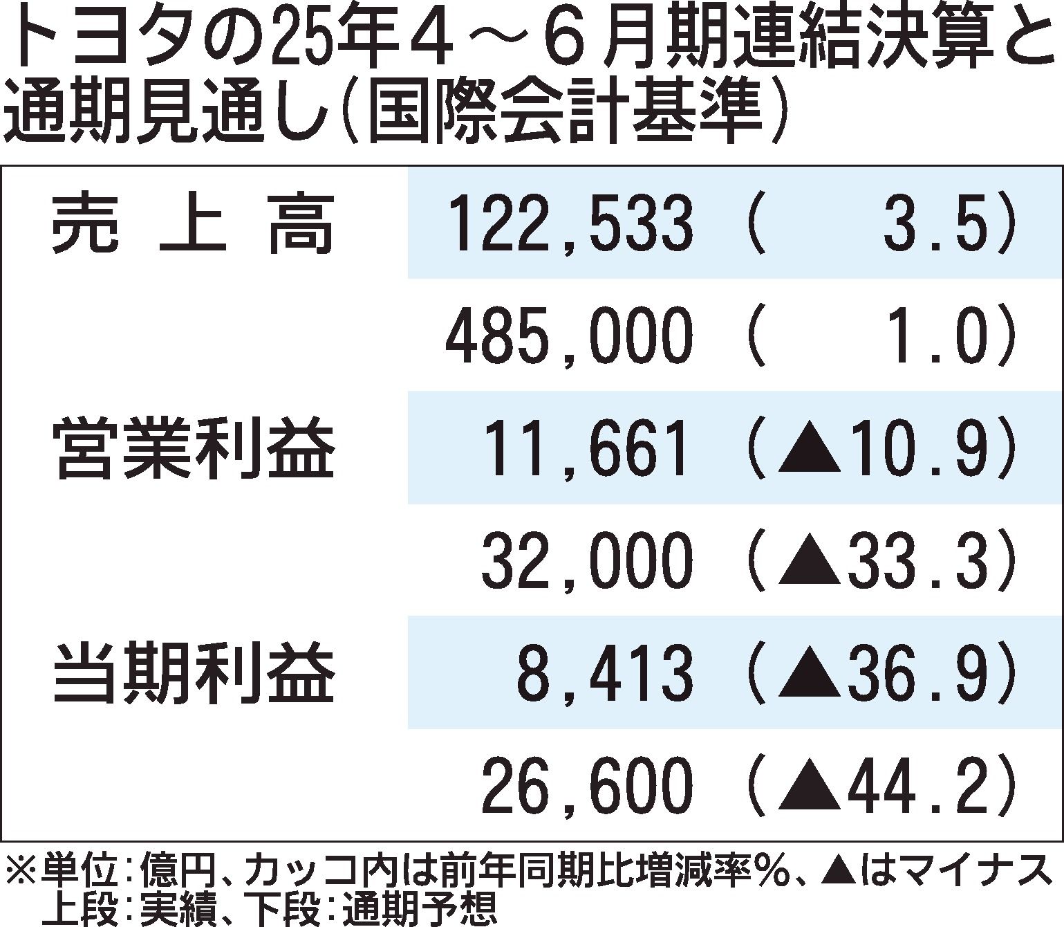トヨタ自動車は7日、2026年3月期の通期業績予想を下方修正すると発表した。期初の公表値に比べ、営業利益は6千億円減の3兆2千億円、当期純利益は4400億円減の2兆6600億円とした。5月の公表時はトランプ米政権の追加関税について4.5月...