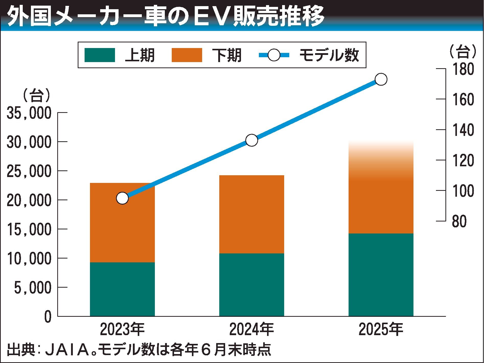 海外勢が電気自動車(EV)の商品投入を加速させている。外国メーカー車のEVモデル数(6月末)は前年同期よりも3割多い173モデルとなり、輸入車販売に占めるEV比率は10%を超える水準に達した。今年度は国産メーカーも相次ぎ新型EVを投入する...