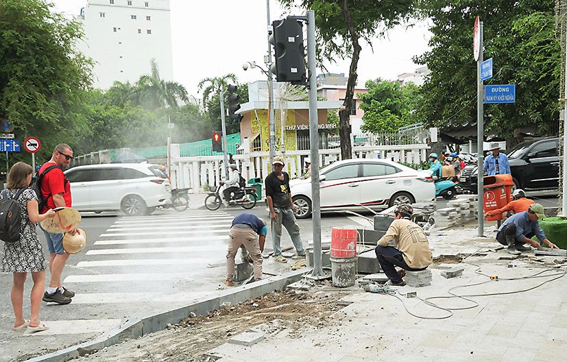 クルマが増加していることもあり、ホーチミン市内でも多数の道路工事を見かけた。ある歩道の工事では、重機や施工機械はほとんど使われておらず、ほぼ手作業の人海戦術で行われていた。欧米系の旅行者が物珍しそうに覗き込んでいた。