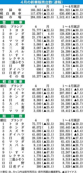 エコカー減税の開始から1カ月を迎える4月の新車販売(登録車と軽自動車の合計)は、前年同月比23.0%減の28万4035台となった。2008年度実績が37年ぶりの300万台割れとなった登録車販売などの底上げに注目が集まったが、出足の1カ月で...
