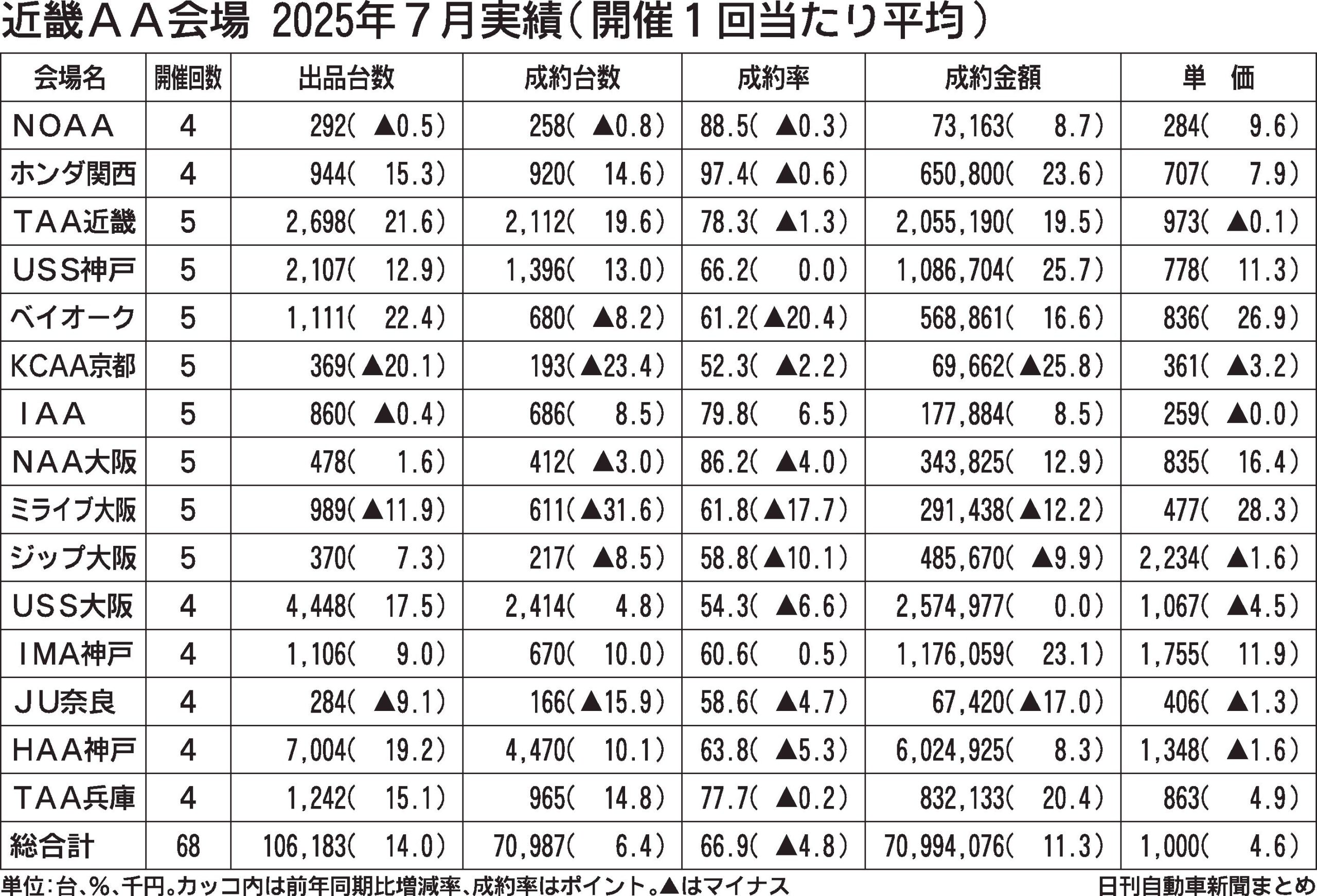 近畿地区の中古車オークション(AA)15会場の7月実績がまとまった。開催回数は前年同月比1回増の68回。出品台数の総合計は同14.0%増の10万6183台で、7カ月連続の前年超えとなった。新車供給の回復に伴って代替えが進み、中古車の流通量...