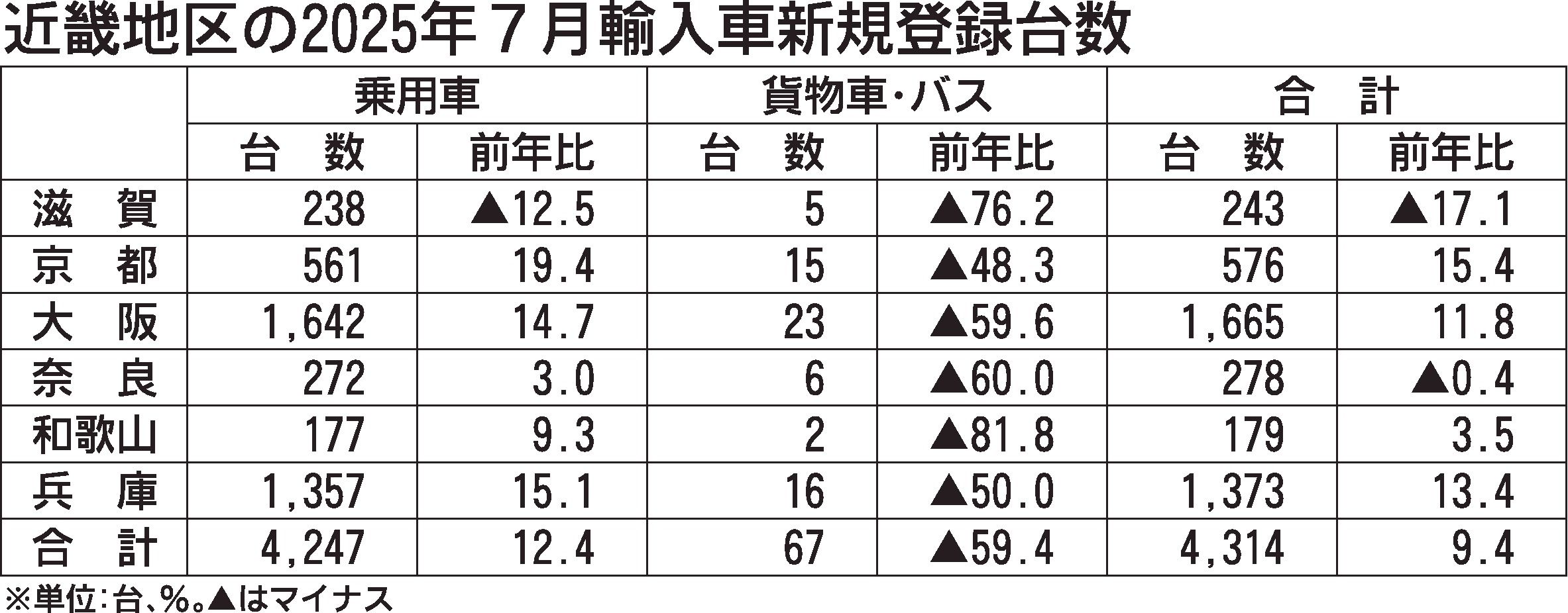 日本自動車輸入組合(JAIA)の発表によると、7月の近畿地区の輸入車新規登録台数(外国メーカー車と日本メーカー車)は、前年同月比9.4%増の4314台で、5カ月連続のプラスだった。日本メーカー車の勢いが弱まったものの、外国メーカー車の伸び...