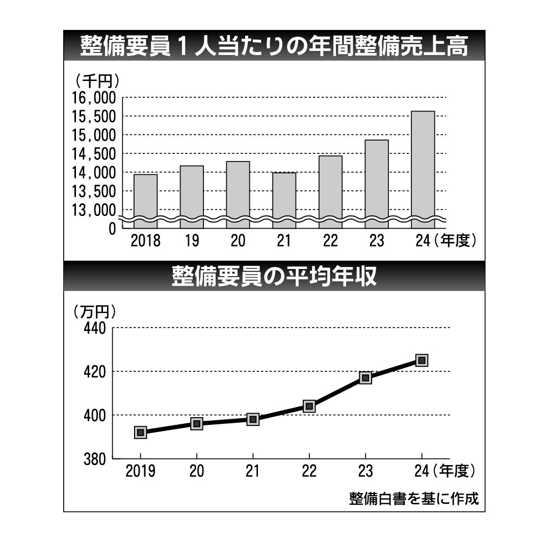 2024年度版「自動車整備白書」では、生産性や整備要員の平均年収についても分析している。24年度調査(23年7月~24年6月に決算が終了した事業実績)では、生産性の指標となる整備要員1人当たりの年間整備売上高は、前年度比5.2%増の156...