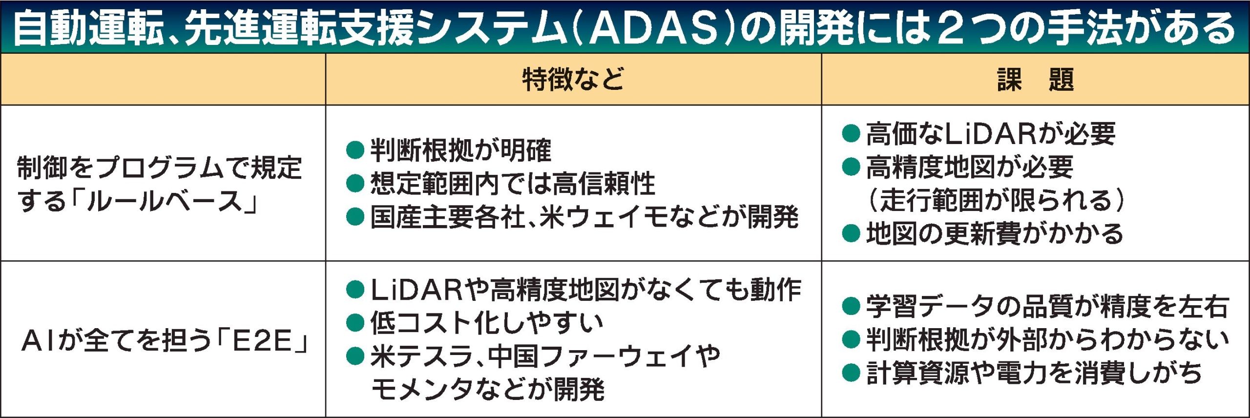 マツダは、先進運転支援システム(ADAS)に認知や判断、操作を人工知能(AI)が担う「エンド・ツー・エンド(E2E)」ベースのシステムを採用する。従来のADASはアルゴリズム(計算手順)による「ルールベース」で開発してきたが、E2Eは、よ...