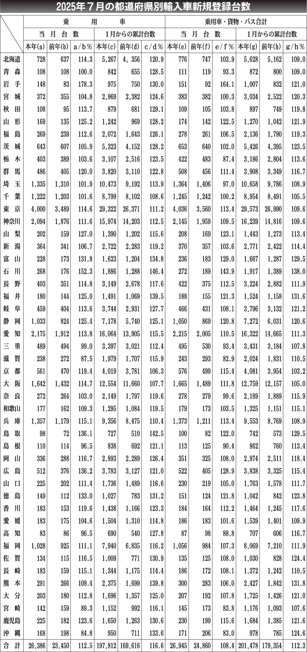 〈2025年7月の都道府県別輸入車新規登録台数〉