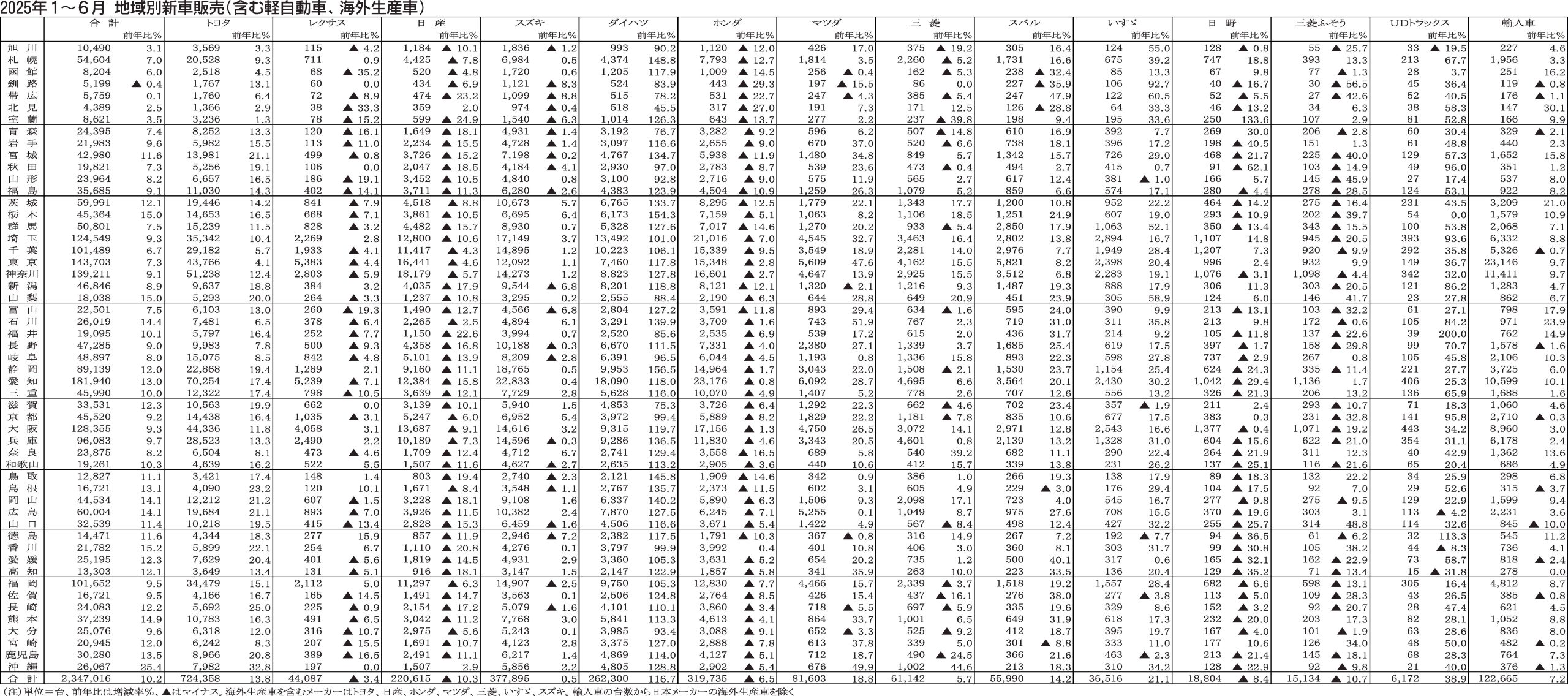 〈2025年1~6月 地域別新車販売(含む軽自動車、海外生産車)〉