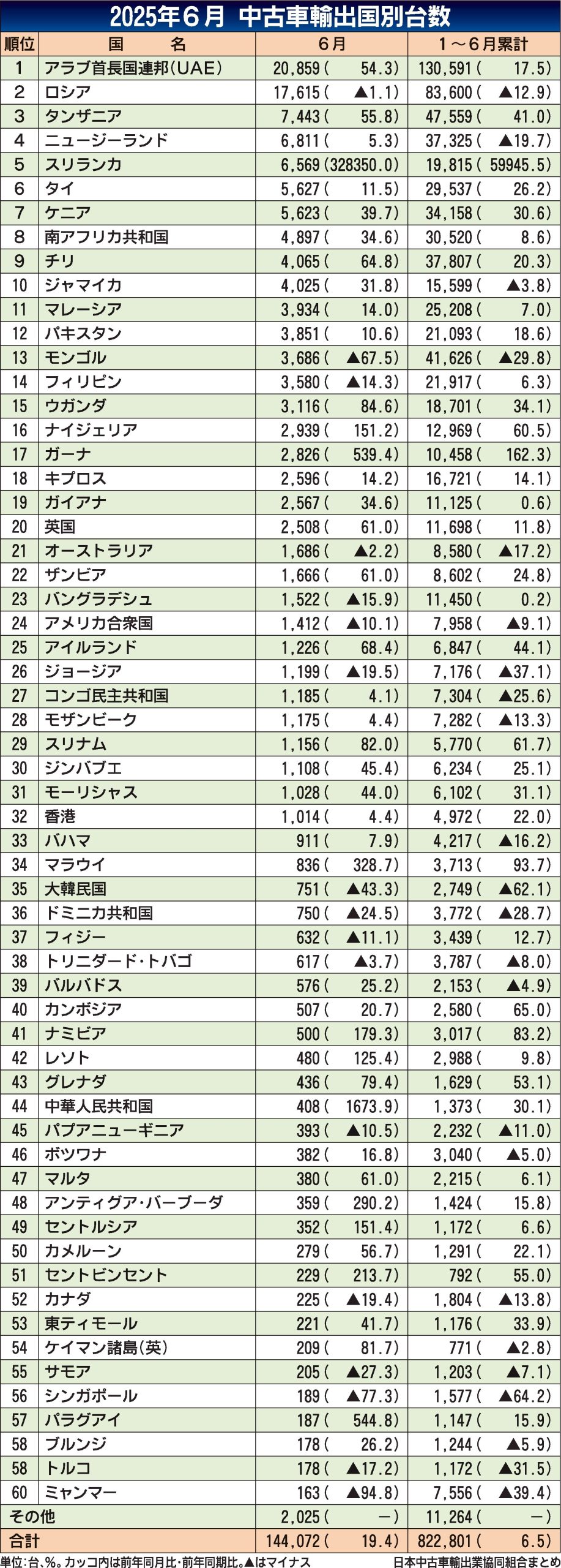 〈2025年6月 中古車輸出国別台数〉
