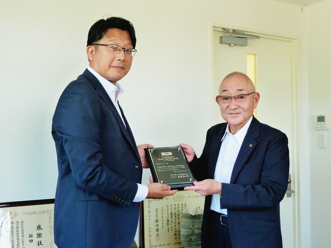 【鳥取】三井住友海上火災保険山陰支店(古池祥蔵支店長)は、ガソリンスタンドなどの事業を営むウミライ(堀田收社長)に、自動車保険の販売体制や顧客対応などが一定以上の水準にあることを認定する、モーター特級代理店の認定証を授与した。モーター特級...