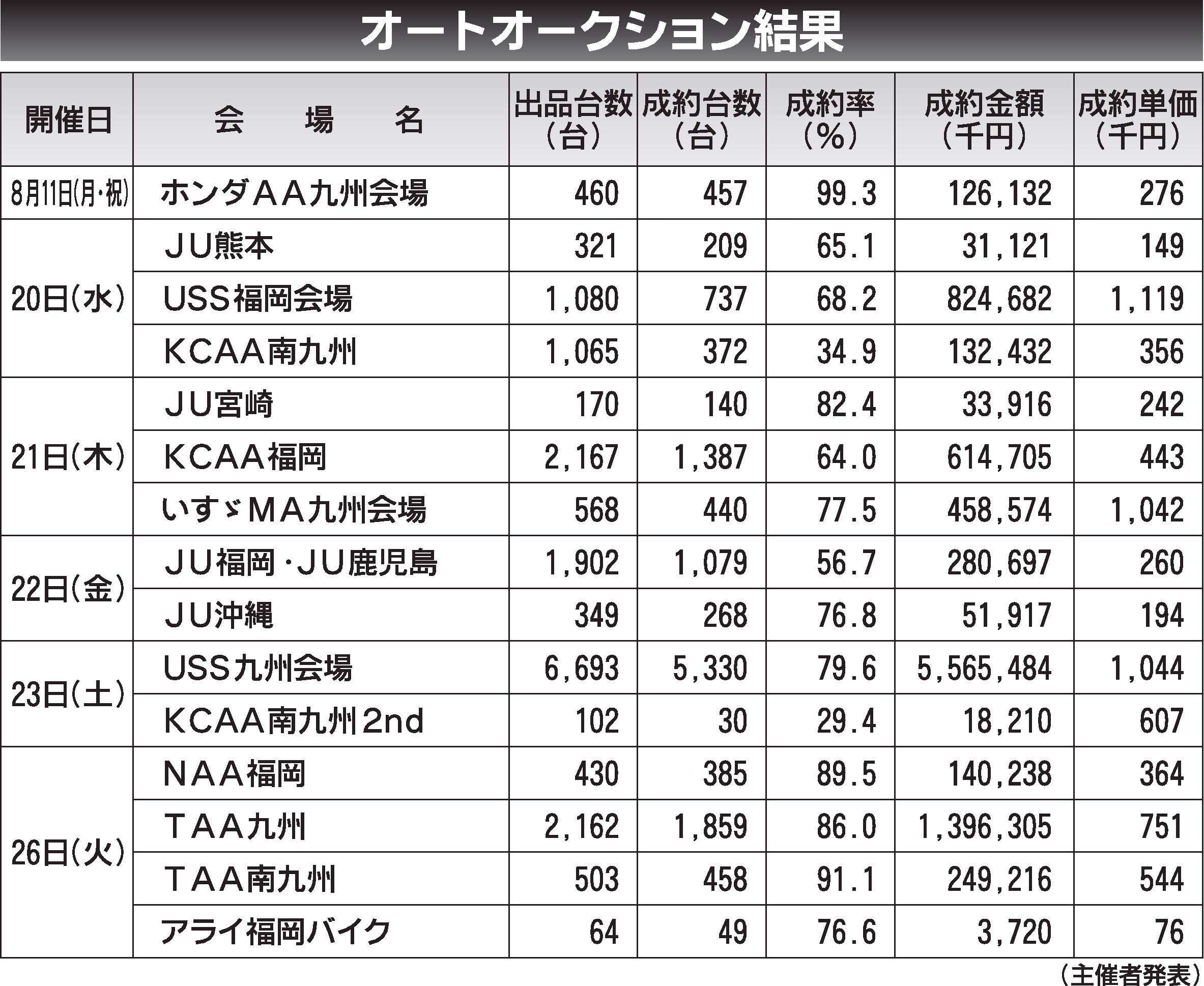 〈オートオークション結果〉九州地区 2025/8/11~26